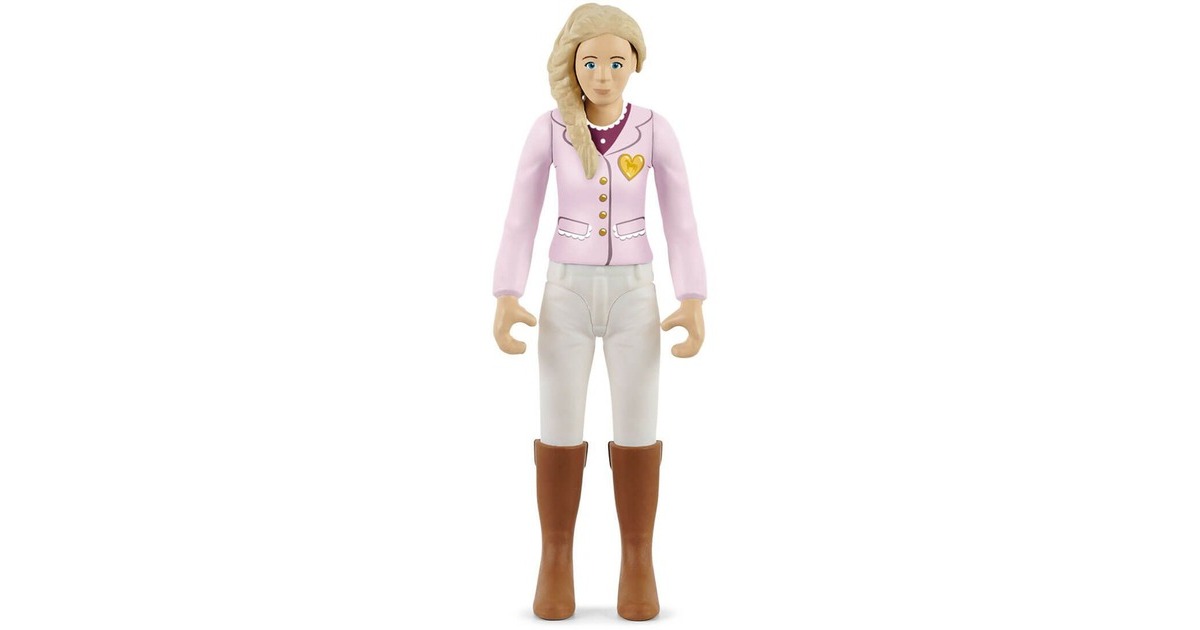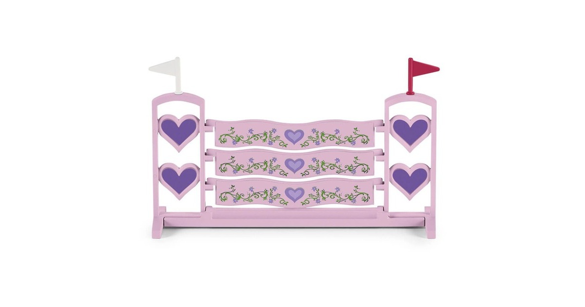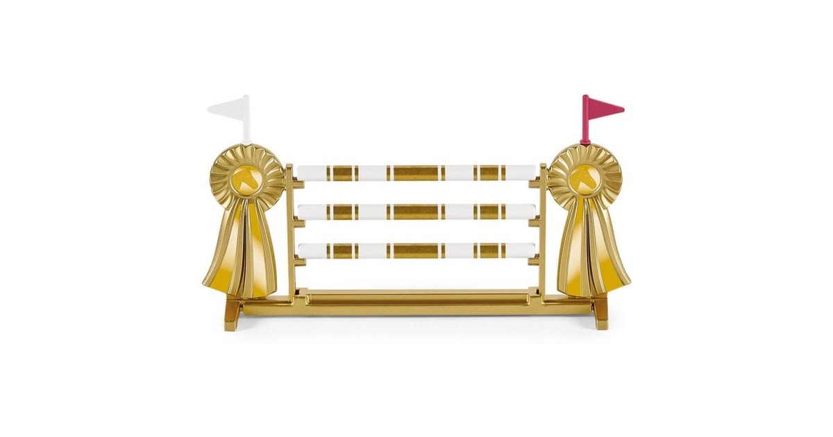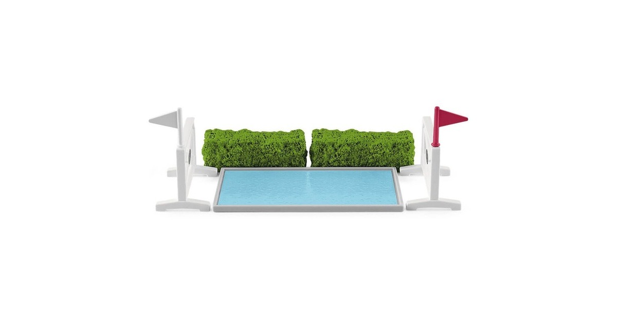 Tribüne, Pferdebox, 2x bewegliche Mädchenfiguren, Trakehner Stute, Araber Stute, Maus, 4x Zaunteile, 2x Zaumzeug mit Zügel, 2x Sättel, Wassergraben, 2x Fahnen, 1x Buchsbaumkübel mit Buchsbaumbogen, 2x Strohballen, Siegerehrungspodium, Herzen Steilsprung, Steilsprung Gold, Kamera mit Stativ, Quitscheentchen, 1x Apfel, Blumenstrauß, 1x Kardätsche, 1x Hufkratzer, 2x Helme, 2 Siegerschleifen, 2x Armbänder. |