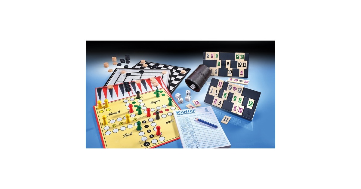In dieser Spielesammlung sind bekannte Klassiker in einem Set vereint: Mensch ärgere Dich nicht, Kniffel, MyRummy, Backgammon, Dame oder Mühle sorgen für abwechslungsreichen Spielspaß mit bis zu 100 Spielvarianten. Dabei ist das Spielmaterial hochwertig verarbeitet und sorgt dadurch für Spielfreude über Jahre hinweg. Art.-Nr.: 1870539