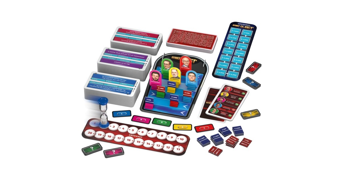 47 lila Quizkarten, 47 blaue Quizkarten, 23 rote Quizkarten, 114 Karten Schnellfragerunde, 5 Jäger Antwortkarten, 1 Sanduhr, 1 Rampe mit 2 Aufstellern, 5 Jäger Plättchen, 10 Standfüße, 15 Antwortkarten, 1 Zählliste, 64 Geldwertchips. |