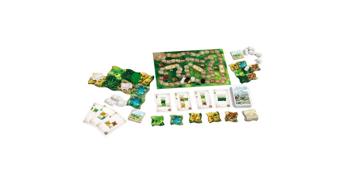 71 Landschaftsplättchen (16× Heu, 15× Wiese, 15× Wald, 13× See, 12× Haus), 9 Wertungsplättchen, 3 Bonusplättchen, 1 Fuchsmarker, 1 Punkteleiste, 55 Karten, 24 Kühe, 4 Zählsteine, 8 Bäume, 1 Spielanleitung |