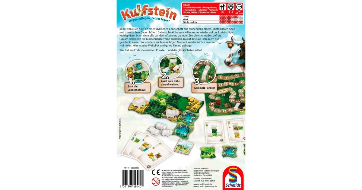 Kuhfstein ist ein einfach zugängliches Legespiel für 2 bis 4 Spieler. Jeder von euch baut an einer idyllischen Landschaft aus blühenden Feldern, kristallklaren Seen und malerischen Bauernhöfen. Dabei schickt ihr eure Kühe immer wieder auf punkteträchtige Weideplätze. Doch nicht alle Landschaften sind zu jeder Zeit gleichermaßen gefragt: Um am Spielende die Kuhschnauze vorne zu haben, müsst ihr eure Tiere nicht nur geschickt einsetzen, sondern auch im richtigen Moment wieder zurück an euren Hof holen. Hier ist also Weitblick und gutes Timing gefragt! Wer hat am Ende die meisten Punkte ... und die glücklichsten Kühe? Plättchen um Plättchen baut ihr eine Landschaft vor euch auf. Mit Hilfe von Karten setzt ihr eure Kühe darauf ein und bekommt dafür Punkte. Achtet dabei jedoch auch darauf, dass ihr eure Kühe nicht zu sehr verteilt. Das macht es euch später einfacher, eure Herden wieder zurück nach Hause zu führen.Art.-Nr.: 100010388