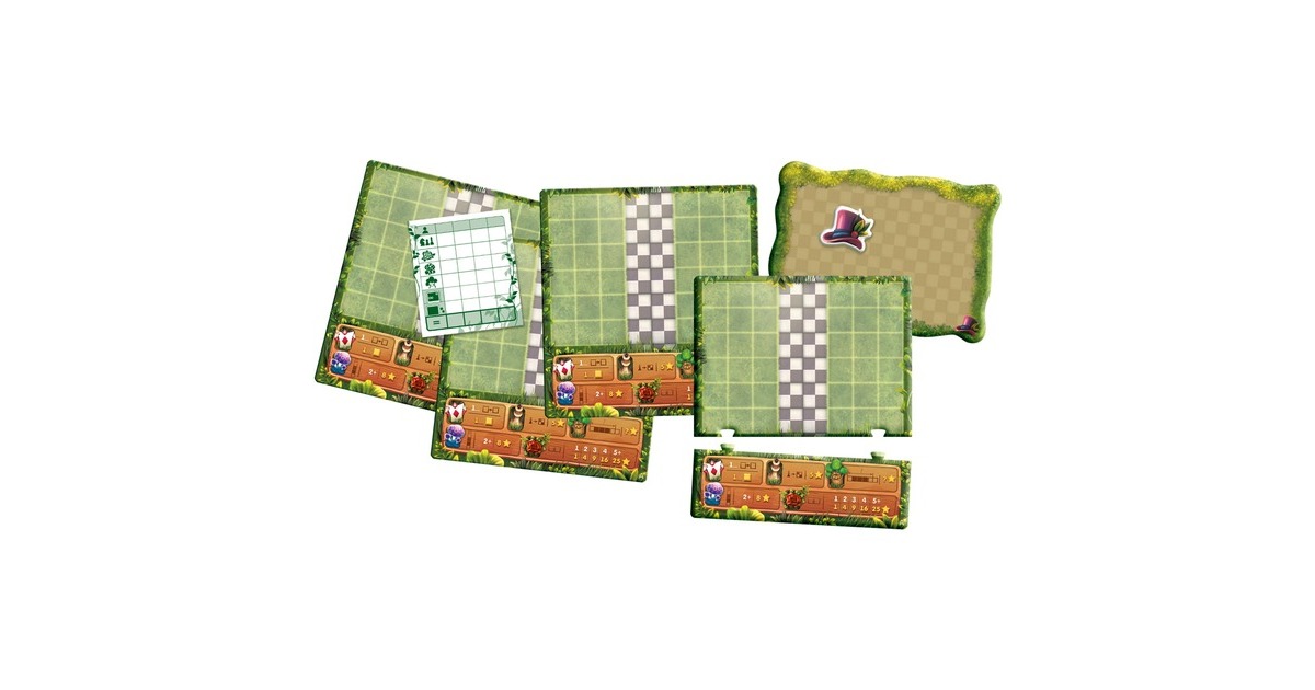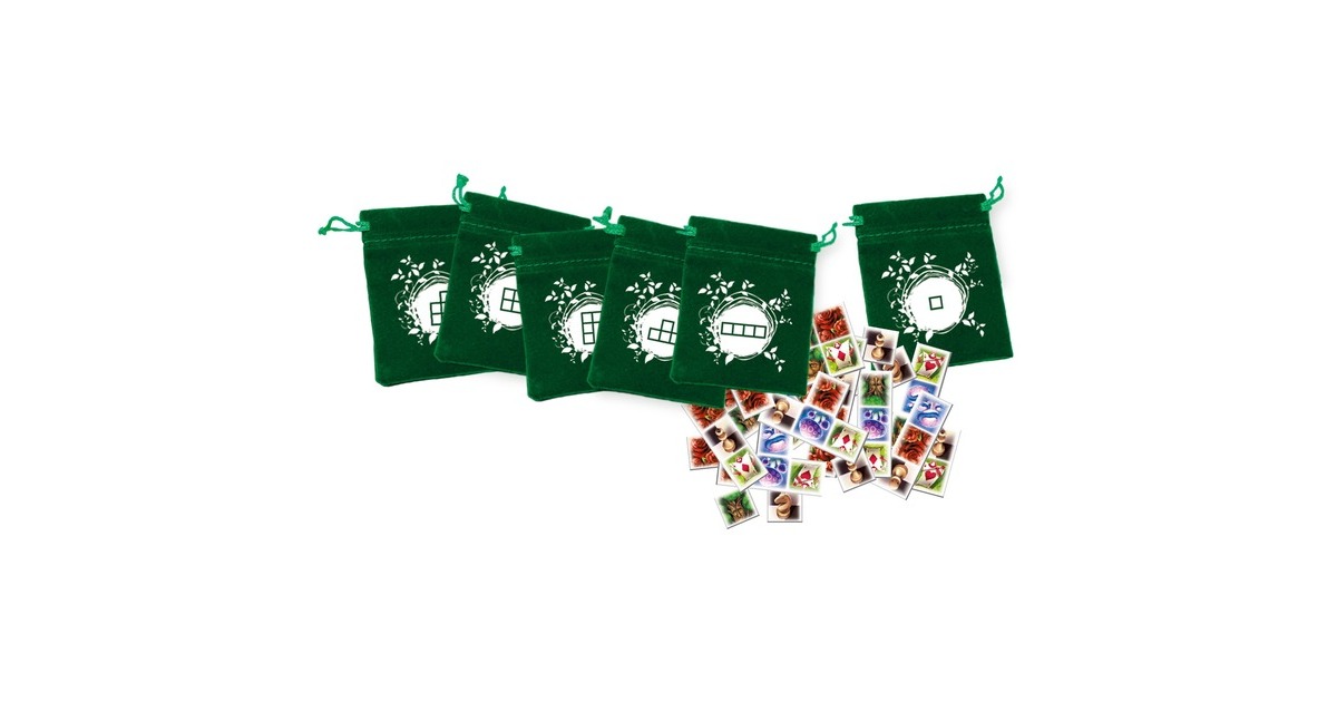 4 Waldtableaus, 6 Beutel, 95 Plättchen, 1 Startmarker, 1 Sammeltableau, 1 Wertungsblock. |