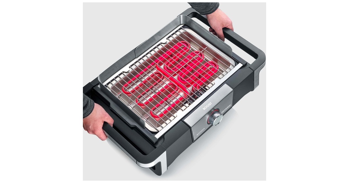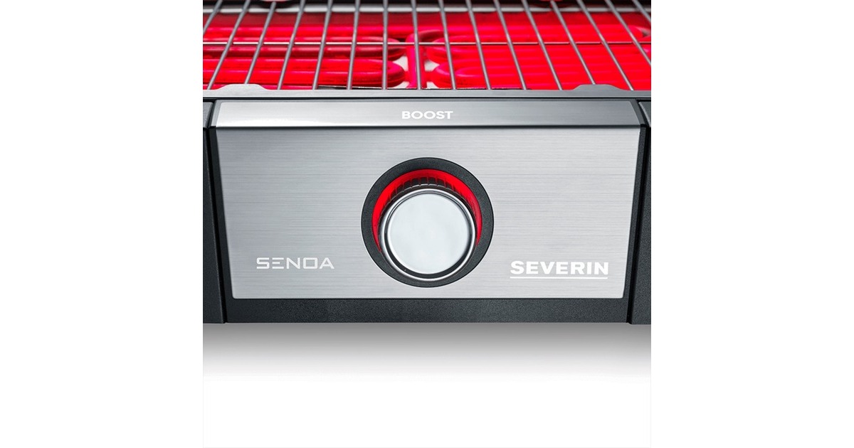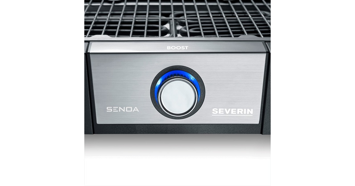 Der SEVERIN Elektro-Tischgrill SENOA BOOST für drinnen und draußen überzeugt besonders durch Leistung: 3.000 Watt und die innovative Doppelheizungs-Technologie sowie eine speziell entwickelte Reflektorschale ermöglichen eine Spitzentemperatur von von bis zu 500°C direkt am Grillgut. Die leistungsstarke Boost-Zone ist so abgeteilt, dass auch ein ZweiZonen-Grillen auf der ca. 41 x 24cm großen Grillfläche möglich ist. Das Thermostat mit großem Drehregler und klarer Skalierung lässt sich leicht bedienen. Ein weiteres Highlight ist die Status-LED-Beleuchtung, die zwischen Orange (Grillen) und Rot (BoostZone) wechselt und so anzeigt, welcher Temperaturbereich auf dem Grill in Benutzung ist. Ein Sicherheits-Mikroschalter stellt das Heizelement bei Entnahme automatisch ab. Der Edelstahl-Grillrost und viele weitere Teile sind entnehmbar, wodurch eine leichte Reinigung möglich ist.Art.-Nr.: 1862299