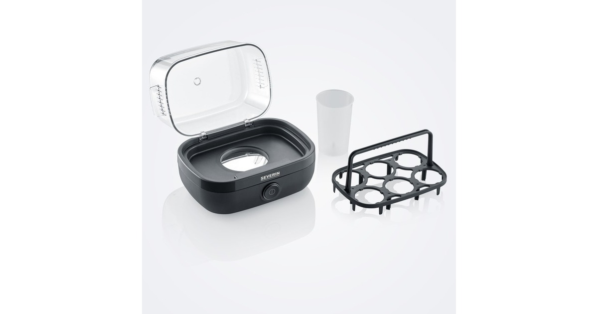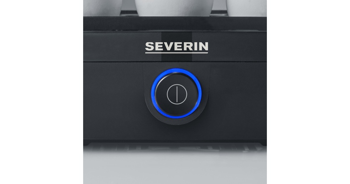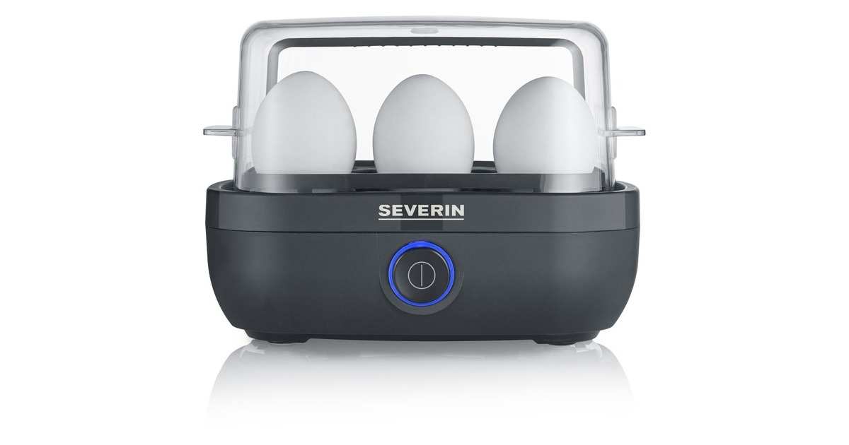 Der Severin Eierkocher EK 3165 bietet Platz für bis zu sechs Eier (S-XL). Mit einer Leistung von 420 Watt lassen sich Frühstückseier optimal kochen. Einfach mit dem beiliegenden Meßbecher kaltes Wasser abmessen, Eier in den Einsatz stellen und abdecken. Die Bedienung erfolgt über einen Ein-/Ausschalter mit LED-Beleuchtung und nach beendeter Kochzeit ertönt ein Signalton. Das Perforieren der Eierschale mit dem Eierstecher verhindert geplatzte Eier.