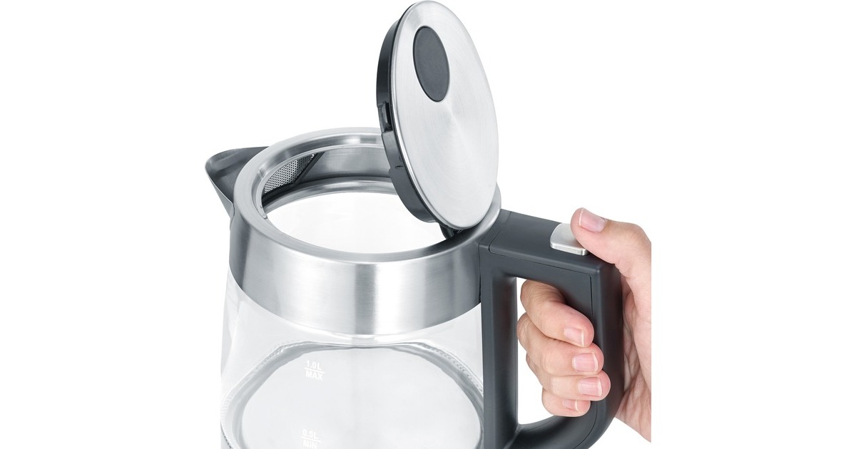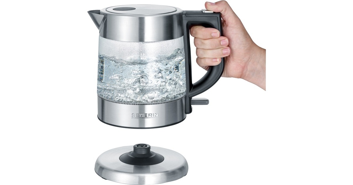 Der Wasserkocher WK 3468 von Severin ist ein kompakter, leistungsstarker Wasserkocher in hochwertiger Glas-Edelstahl-Kombination und 360° central-cordless system. Die 1-Hand-Bedienung ist praktisch und angenehm. Der integrierte Fingerschutz am Deckel, die Dampfstopp-Automatik und der Überhitzungsschutz sorgen für Sicherheit. Der Wasserbehälter lässt sich dank verdeckter Heizschlange (Abdeckung aus Edelstahl) und klappbarem Deckel mit großer Öffnung leicht reinigen und das Anti-Kalk-Sieb sorgt für sauberes Wasser beim Ausgießen.