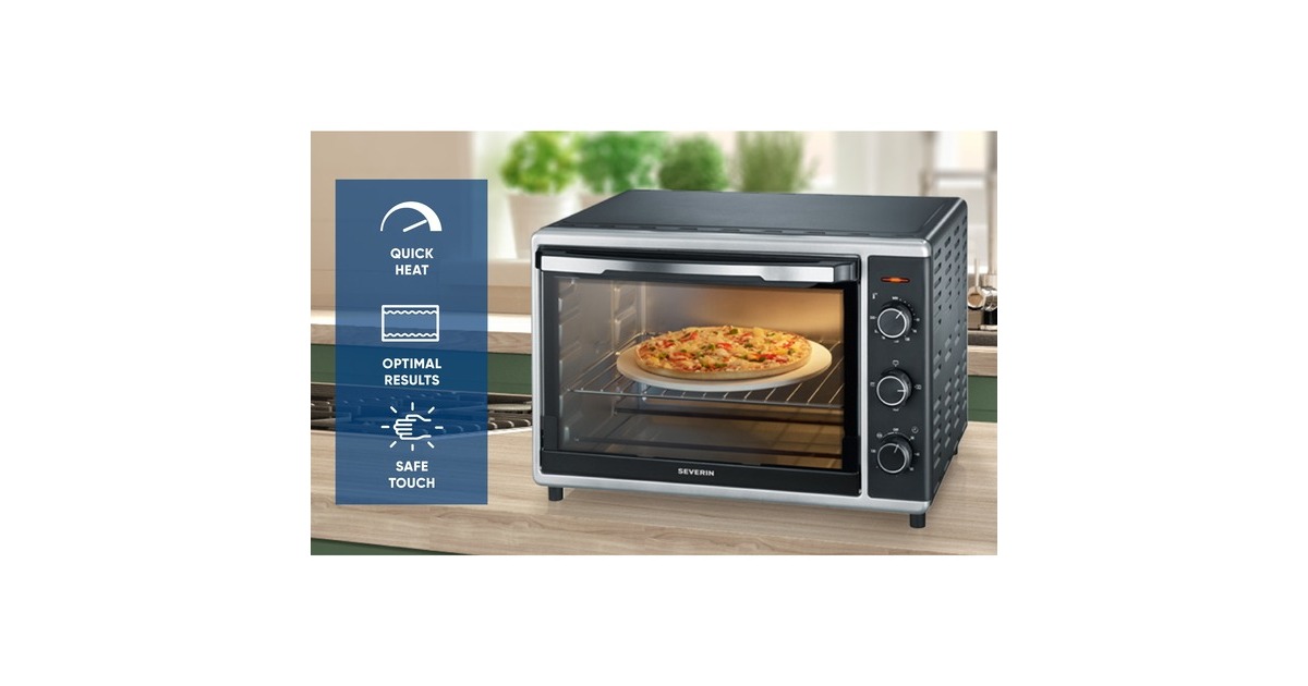 Der Severin Toastofen TO 2058 mit Umluftfunktion und einem 42 Liter Garraum eignet sich wunderbar zum Zubereiten von Toast, Kroketten oder anderen Ofengerichten. Zudem ist er auch für große Pizzen mit bis zu 29 cm Durchmesser geeignet. Er bietet mit Ober-/Unterhitze und Umluftfunktion viele Möglichkeiten für gleichmäßige Gar- und Backergebnisse. Die Temperatur lässt sich stufenlos über einen Drehregler zwischen 60-230°C einstellen. Der Toastofen TO 2058 verfügt über einen praktischen Drehspieß für die Zubereitung von Fleisch und Geflügel sowie einem Pizzastein. Das herausnehmbare Krümelblech erleichtert die Reinigung des Ofens. Im Lieferumfang ist ein Grill- und Backrost und ein Backblech mit 38,5 x 31,5 cm Fläche enthalten.Art.-Nr.: 1082817