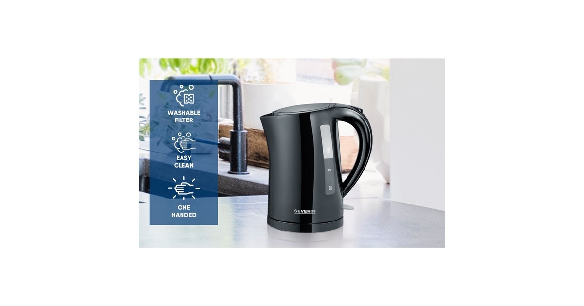 Der Wasserkocher WK 3498 von Severin fasst bis zu 1,5 Liter Wasser und hat eine überzeugende Leistung von 2.200 Watt. Dank dem 360º central-cordless-system ist der Wasserbehälter aus jeder Richtung auf den Gerätesockel aufsetzbar. Mit integrierter Dampfstopp-Automatik, Überhitzungsschutz, wärmeisoliertem Kunststoffgriff und rutschfesten Gummifüßen ist der Wasserkocher WK 3498 auch in Bezug auf Sicherheit eine gute Wahl. Der Wasserbehälter lässt sich dank verdeckter Heizschlange (Abdeckung aus Edelstahl) leicht reinigen, und das Anti-Kalk-Sieb sorgt für sauberes Wasser beim Ausgießen.Art.-Nr.: 1340221