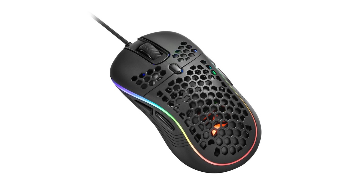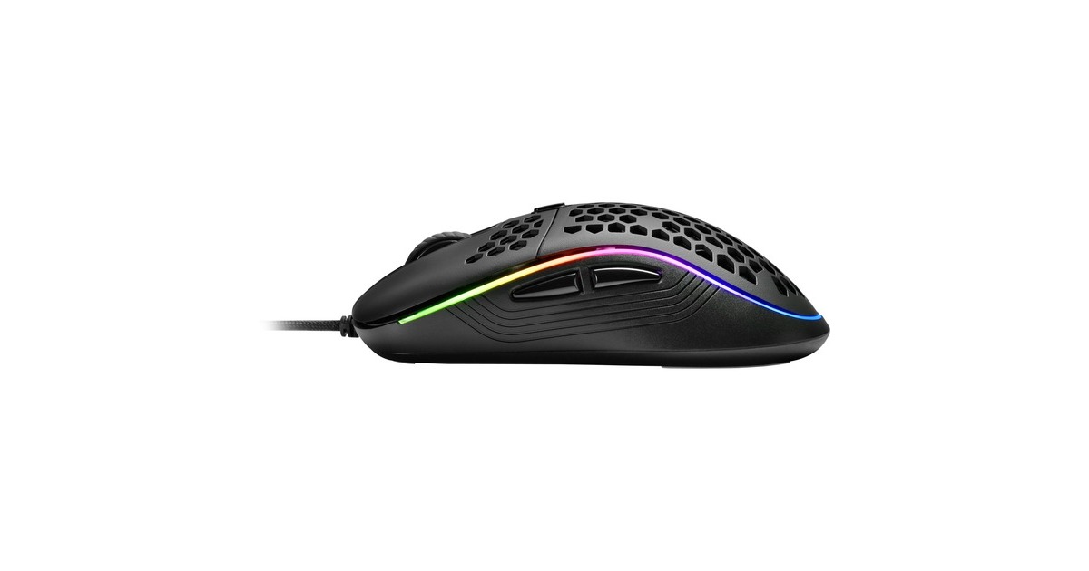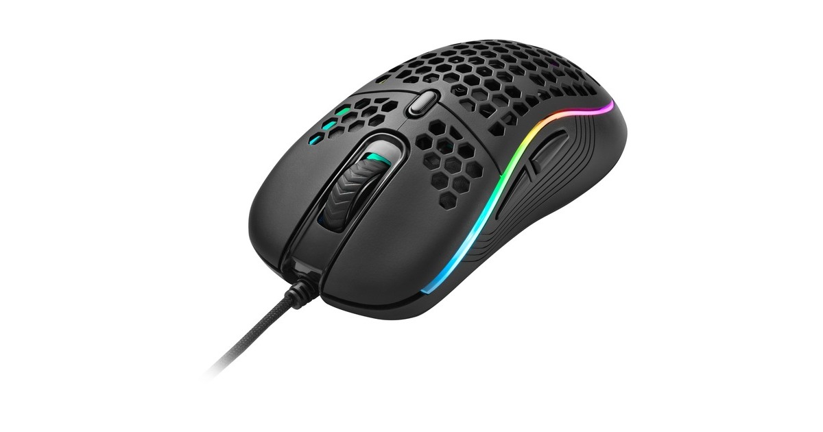 Programmierbare Tasten | Langlebige Omron-Schalter in linker und rechter Maustaste | Wabenstruktur | DPI-Stufen: 600, 1.800, 3.000, 4.200, 6.200 dpi || 5 DPI-Stufen, vollständig anpassbar |LED-DPI-Anzeige | Onboard-Speicher für 5 Spiel-Profile | Goldbeschichteter USB-Stecker | Ultraflexibles, textilummanteltes Kabel | Gaming-Software |