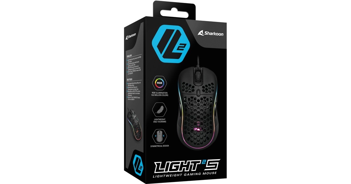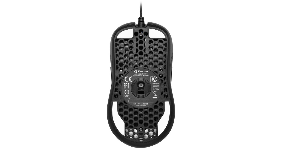 Als Gaming-Maus der Light²-Serie bringt auch die Light² S von Sharkoon ein spürbar niedriges Gewicht auf die Waage. Durch ihr Gehäuse mit Wabenstruktur kommt sie auf 78 Gramm, wodurch sie angenehm leicht in der Hand liegt, zugleich jedoch enorm robust ist. Dank des vollständig symmetrischen Designs ist sie beidhändig nutzbar und kann von Gamern mit der bevorzugten Hand und Griffart geführt werden. Für ungebremsten Spielspaß und eine hohe Geschwindigkeit sind die vier Mausfüße aus 100 % PTFE gefertigt, wodurch die Light² S reibungslos übers Mauspad