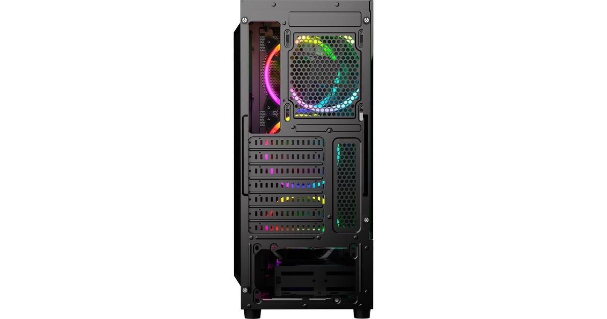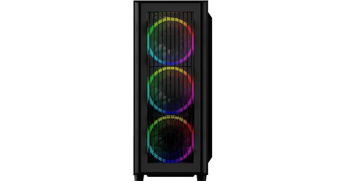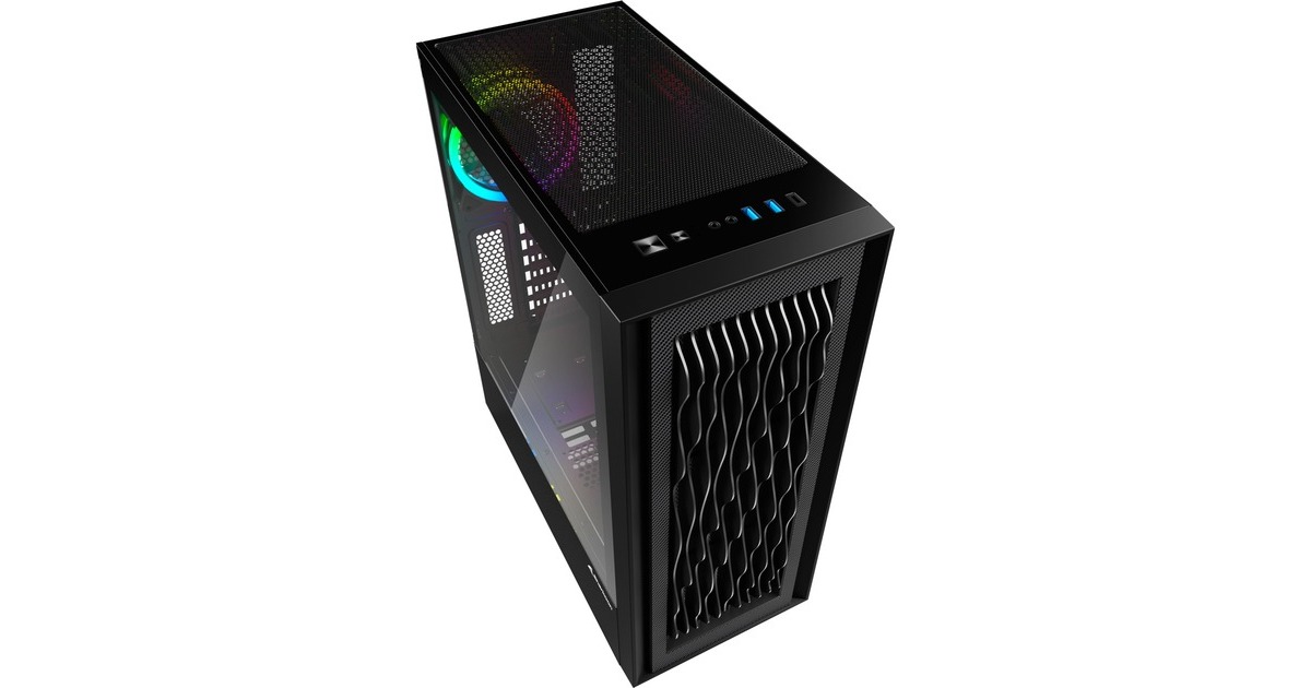 Für Gamer oder Wellenreiter: Die luftdurchlässige Frontblende des RGB Wave ziert ein eindrucksvolles 3D-Wellenmuster, hinter dem gleich drei RGB-Lüfter erstrahlen. Zusammen mit dem an der Rückseite installierten 120-mm-Lüfter bleibt in dem Midi-ATX-Gehäuse direkt alles cool. Zusätzlich verfügt das RGB Wave über eine I/O-Blende mit zwei USB 3.2-Anschlüssen und einem USB-Type C-3.2 Gen 2-Anschluss, sowie ein Seitenteil aus gehärtetem Glas. Beim RGB Wave bietet die Front einen besonderen Blickfang. Über die Vorderseite spannen sich Kunststoff-Lamellen, die dem Ganzen ein spezielles 3D-Wellen-Design verleihen. Dieses wird hervorgehoben durch die Beleuchtung der drei 120-mm-RGB-Lüfter, die direkt dahinter vorinstalliert sind. Den letzten Schliff gibt der Rahmen mit Karbonfaser-Textur, der um das Wellenmuster herum verläuft. Im RGB Wave ist alles gegeben, um eine kühlende Belüftung möglich zu machen, angefangen bei der Front, durch die Luft einfach ins Gehäuse fließen kann. Es sind ab Werk direkt vier 120-mm-RGB-Lüfter eingebaut, drei in der Front und einer an der Rückseite. Um den Airflow weiter zu begünstigen, ist an der Oberseite optional Platz für zwei weitere Lüfter mit einem Durchmesser von 120 mm oder 140 mm. Auch an der Oberseite des Netzteiltunnels lässt sich bei Bedarf noch ein 120-mm-Lüfter installieren. Neben seiner schicken Front ist das RGB Wave durch das Seitenteil aus gehärtetem Glas zusätzlich ein eleganter Schaukasten. Die eingebauten Komponenten kommen bestens zur Geltung und lassen sich optimal präsentieren. Um den klaren und aufgeräumten Eindruck möglich zu machen, können sämtliche Kabel mittels Kabeldurchlässen aus dem Blickfeld geführt werden. Mit seinen schlanken Abmessungen macht das RGB Wave eine gute Figur und lässt sich einfach in jedes Setup integrieren. Gleichzeitig findet in dem kompakten Midi-ATX-Gehäuse auch größere Hardware ihren Platz: Grafikkarten können bis zu 33,5 cm lang sein, CPU-Kühler bis zu 15,7 cm hoch und Netzteile bis zu 17,5 Zentimeter lang. Wer Wert auf massig Speicherplatz legt, kann bis zu fünf SSDs im Gehäuse montieren. Zusätzlich lassen sich zwei 3,5-Zoll-HDDs im Festplattenkäfig unterbringen, wenn dort keine SSDs installiert sind.