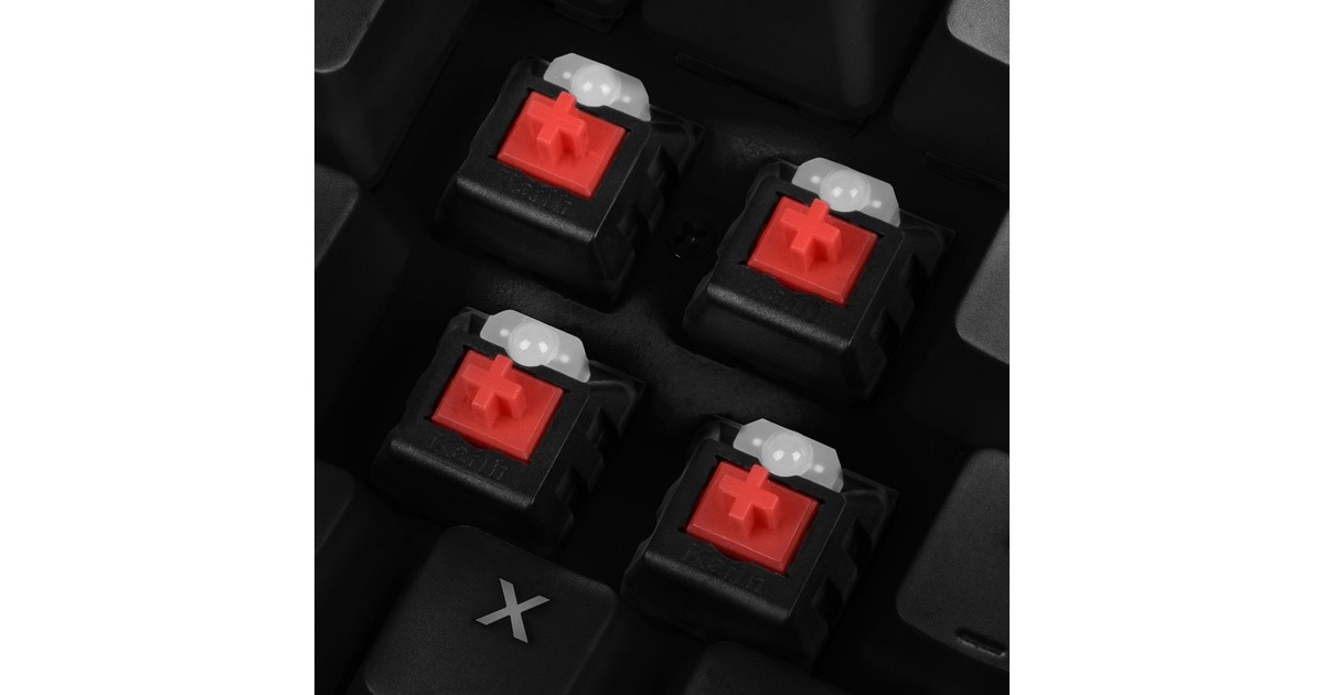 RGB-Beleuchtung, anpassbar (20%, 40%, 60%, 80%, 100%, aus), 20 vorprogrammierte Beleuchtungseffekte; intuitive Gaming-Software mit bis zu 3 Spiel-Profilen; 6-Key-Rollover; austauschbare Funktion der Pfeiltasten mit WASD-Sektion; textilummanteltes Kabel; Kailh Red Schalter (linear): fühlen sich vom Moment, an dem man eine Taste zu drücken beginnt, bis zu dem Moment, an dem man die Taste vollständig durchgedrückt hat, stets gleich an. Es gibt kein taktiles oder akustisches Feedback um einen erfolgreichen Tastendruck zu bestätigen |