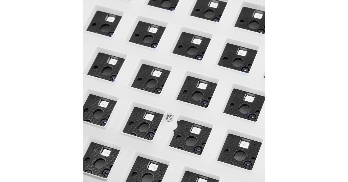 ABS-Tastenkappen, doppellagige Silikondämpfung, Positionierungsplatte aus Polycarbonat, QMK- und VIA-kompatibel |
