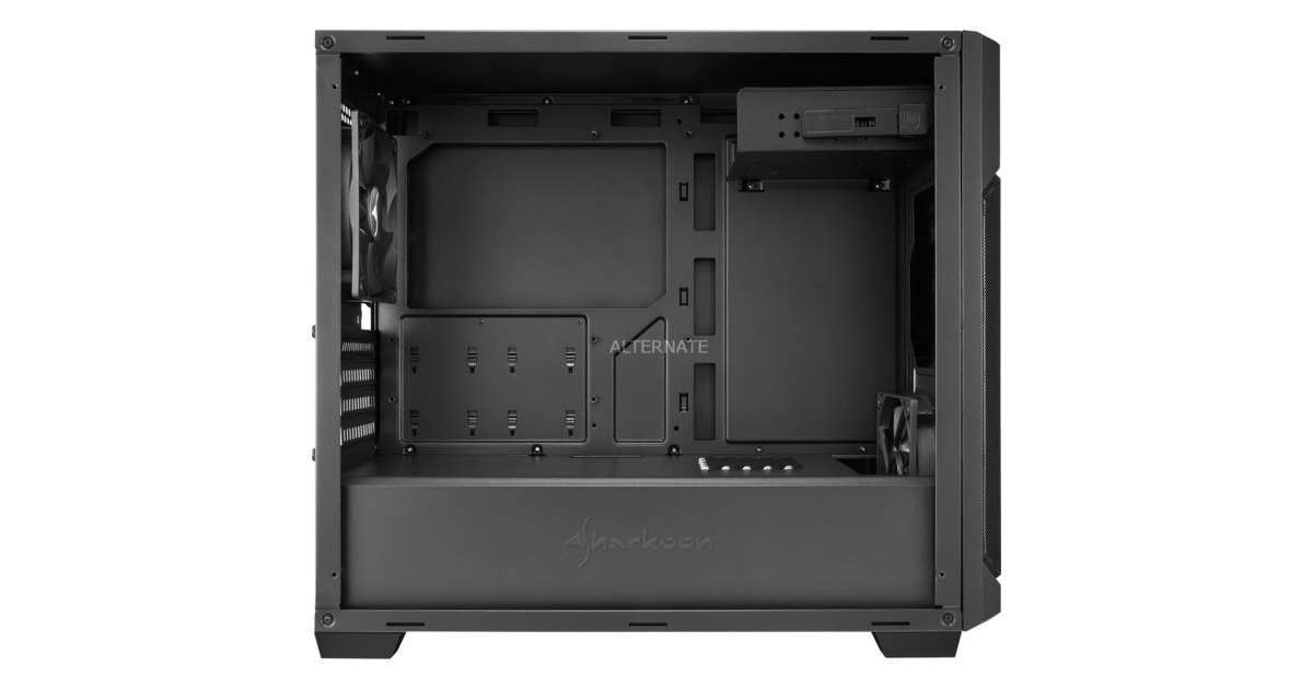 Ob anspruchsvoller Office-Rechner, kompakte Multimedia-Station oder preiswerter Spiele-PC: Das V1000 von Sharkoon bietet vielfältige Lösungen für Individualisten. Mit einer Größe von 45 x 19,5 x 40,2 cm ist das Micro-ATX-Gehäuse klein genug, um auch unter niedrige Schreibtische zu passen. Dennoch bietet es viel Platz für komfortable Extras, die sich sonst nur in ATX-Gehäusen unterbringen lassen. Dazu gehört ein Tunnel an der Gehäuseunterseite, der für den diskreten Einbau des Netzteils inklusive Verkabelung sorgt sowie für eine separate Abfuhr der aufgeheizten Luft. Das großzügige Platzangebot des V1000 bietet darüber hinaus vielfältige Möglichkeiten zum Einbau aller nötigen Komponente und sogar eines Radiators in der Gehäusefront. Um selbst anspruchsvolle Komponenten mit ausreichend Frischluft zu versorgen, besteht die Frontblende des V1000 im Bereich der vorderen Lüftereinbaumöglichkeiten aus einem durchlässigen Mesh-Gitter. Die Luft wird durch dieses vom vorinstallierten 120-mm-Lüfter angesaugt und durch einen abnehmbaren, leicht zu reinigenden Staubfilter ins Gehäuse befördert. Der vorhandene Lüfter kann mit einem weiteren 120-mm-Lüfter ergänzt werden. Alternativ können auch zwei 140-mm-Lüfter verbaut werden. Wer es noch cooler mag, kann bequem einen 240-mm-Radiator einbauen oder sogar einen 280-mm-Radiator bei entfernter Laufwerkshalterung. Die Höhe der Radiatoren inklusive Lüfter kann maximal 5,9 cm betragen. Ein weiterer vorinstallierter 120-mm-Lüfter an der Gehäuserückseite sorgt anschließend für die Abfuhr der aufgeheizten Luft. Wer einen weiteren 120-mm-Lüfter installieren möchte, findet dafür Platz im Seitenteil aus Metall . Der blickdichte Tunnel an der Gehäuseunterseite erhält ebenfalls Frischluft durch den vorinstallierten Lüfter in der Front und eine Öffnung im Gehäuseboden. Diese ist auch durch einen vorinstallierten Staubfilter geschützt, damit das Gehäuse sauber bleibt. Die aufgeheizte Luft aus dem Tunnel gelangt nicht ins Gehäuseinnere und wird separat abgeleitet. Durch diesen separierten Luftkreislauf wird der Netzteillüfter entlastet und das Betriebsgeräusch reduziert. Im Tunnel können Netzteile mit einer maximalen Länge von bis zu 24 cm montiert werden. Er beinhaltet ebenfalls einen Festplattenkäfig. In diesem finden zwei 3,5-Zoll- oder zwei 2,5-Zoll-Festplatten Platz. Wie bei der Lüftermontage kommen auch hier praktische Langlöcher zum Einsatz, wodurch sich der Festplattenkäfig flexibel verschieben lässt. Bei Netzteilen ohne eigenes Kabelmanagement-System kann so zusätzlicher Platz für eine diskrete Verkabelung geschaffen werden. Zahlreiche Kabeldurchlässe im Gehäuseinnere sorgen dafür, dass auch die restliche Verkabelung sauber hinter dem Mainboardtray verschwinden kann. Hier befinden sich ebenfalls Halterungen für zwei zusätzliche 2,5"-Festplatten/SSDs. Eine Installationsöffnung im Tray erleichtert zudem den Einbau von CPU-Kühlern. Diese können eine maximale Höhe von 15,5 cm haben. Die maximale Länge der einsetzbaren Grafikkarte kann, wie sonst nur bei Gehäusen mit ATX-Formfaktor, 40 cm betragen.Art.-Nr.: 1088652
