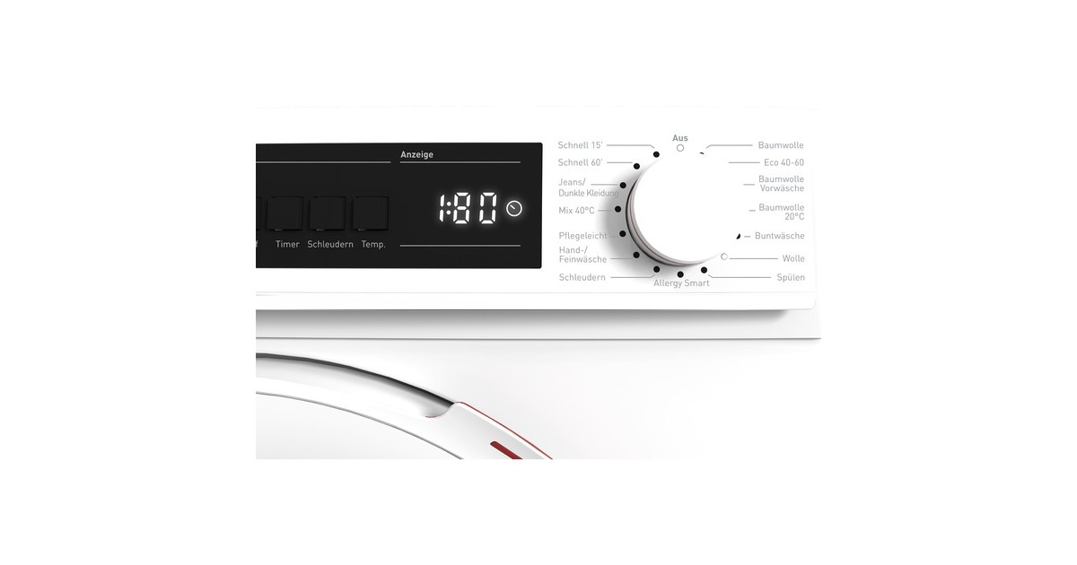 15 Programme: Baumwolle 90°C, Eco 40-60, Vorwäsche 60°C, Baumwolle 20°C, Buntwäsche, Wolle 30°C, Spülen, Allergy Smart, Schleudern, Hand-/Feinwäsche 30°C, Pflegeleicht, Mix 40°, Jeans, Schnell 60°C/60', Schnell 30°C/15' |