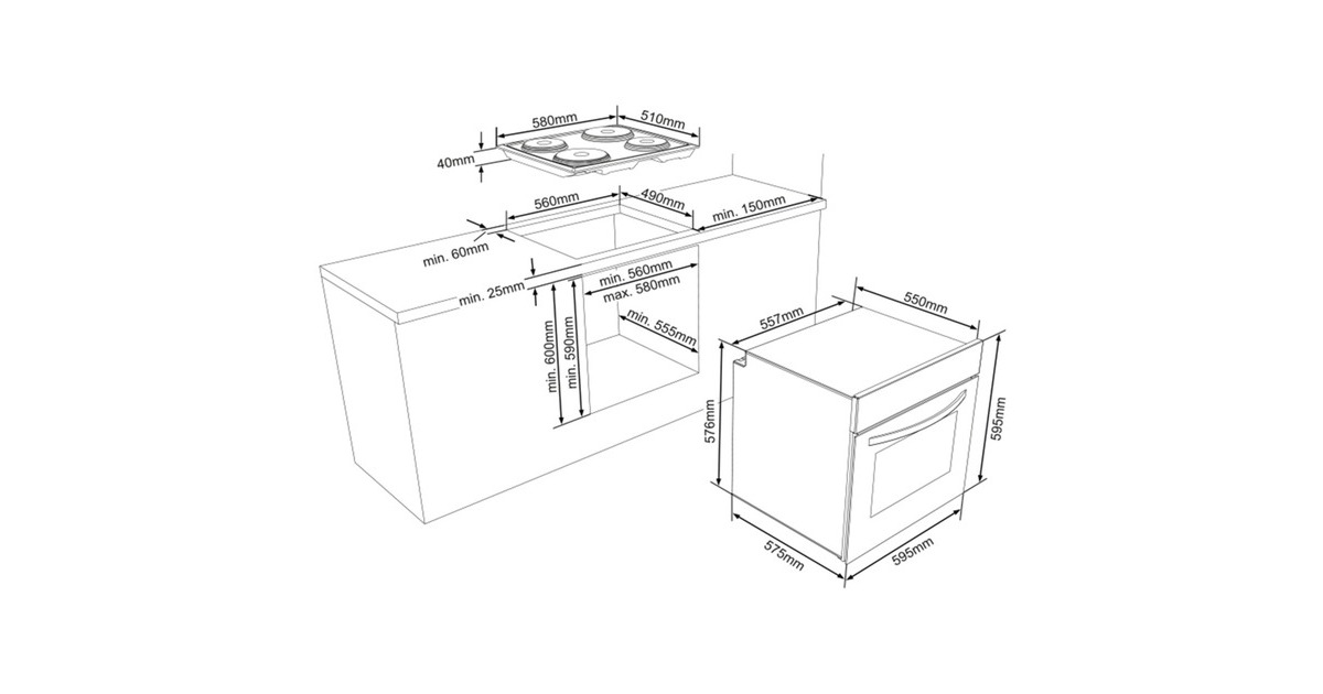 Gerätemaße Kochfeld (HxBxT): 4,1 x 59 x 52 cm | Ausschnittmaße Kochfeld (HxBxT): 30 x 56 x 49 cm | Gerätemaße Backofen (HxBxT): 59,5 x 59,5 x 57,5 cm | Nischenmaße Backofen (HxBxT): 58 x 60 x 55,5 cm |