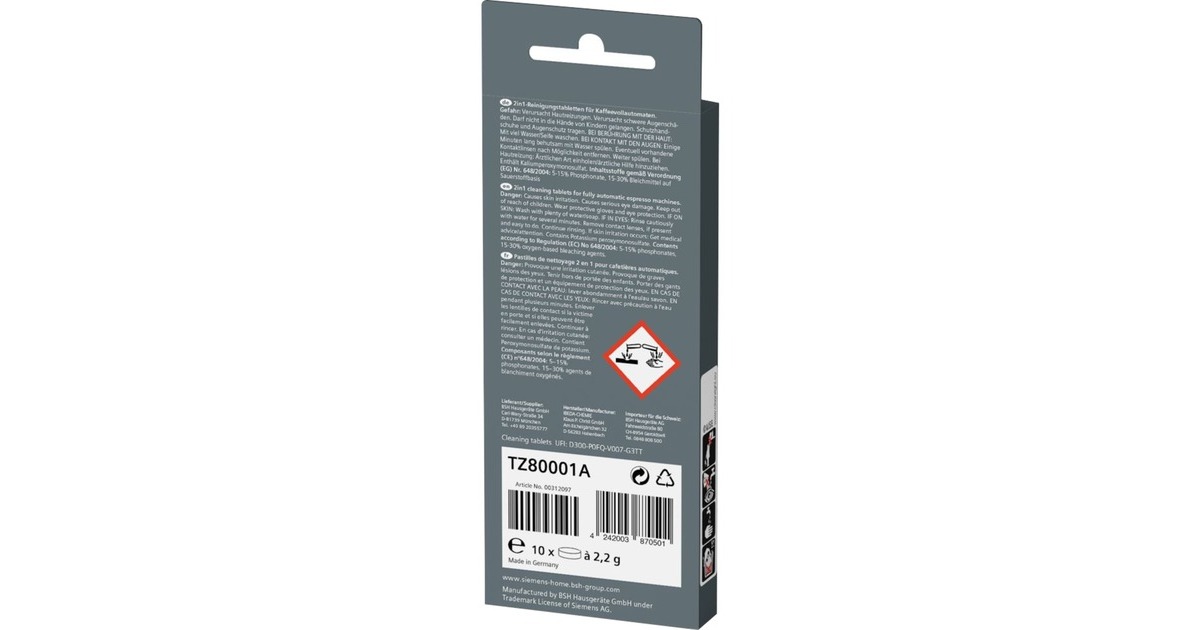 Die Reinigungstabletten TZ80001A von Siemens machen eine gründliche und zuverlässige Reinigung für pures Aroma kinderleicht. Durch optimale Reinigung wird ein perfektes Aroma erreicht, Rückstände von Kaffeeölen werden ideal entfernt. Die 2in1 Funktion sorgt für bestes Aroma und ein langes Geräteleben. Die Reinigungstabletten TZ80001A sind optimiert für das automatische Reinigungsprogramm von Siemens Kaffeevollautomaten.Art.-Nr.: 1571948
