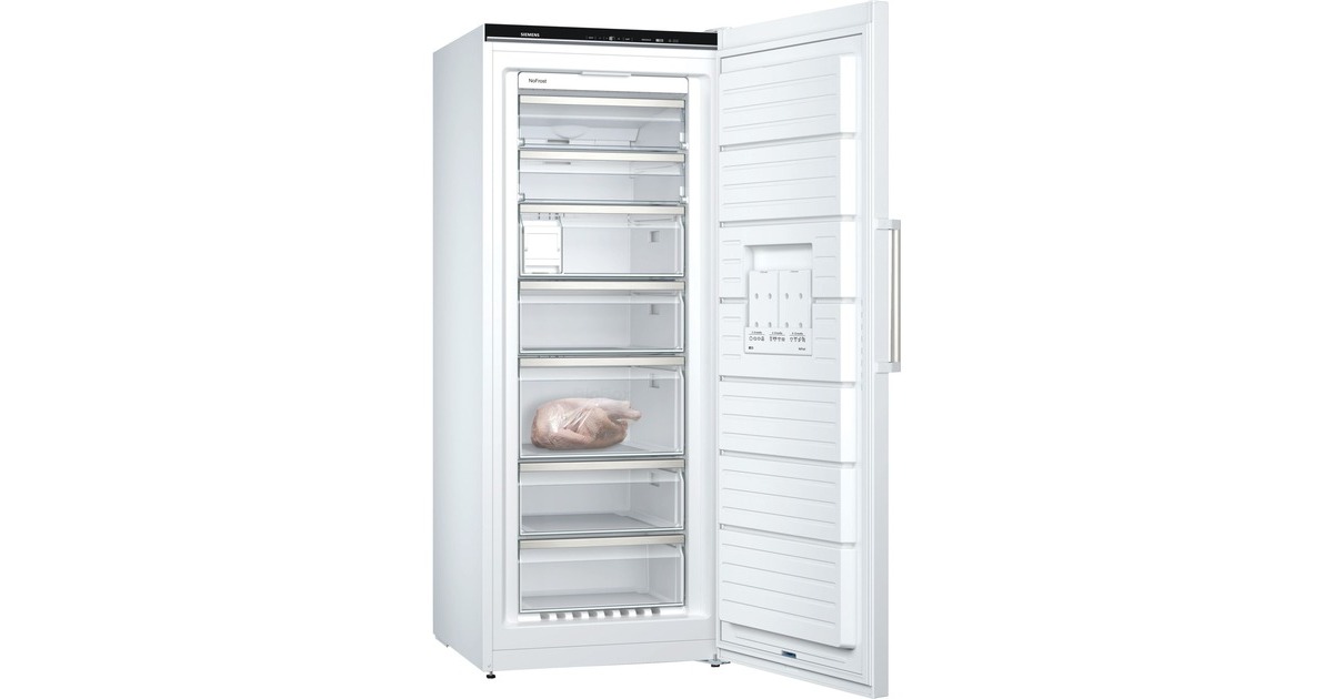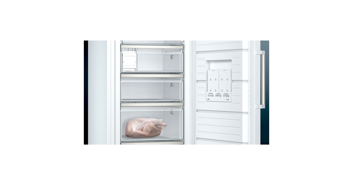Der Gefrierschrank Siemens GS54NAWCV bietet einen Gesamtnutzinhalt von 328 Litern und jede Menge Komfort. Neben zwei Gefrierfächern mit transparenter Klappe ist er mit fünf transparenten Gefrierschubladen ausgestattet, davon eine bigBox zum Stapeln von Einfrierbehältern oder für großes Gefriergut. Dank varioZone lassen sich die Schubladen und die Glasablagen zwischen den Schubladen problemlos neu anordnen, um den Raum im Gefrierschrank flexibel zu gestalten. Mit der noFrost-Technologie wird mühsames Abtauen überflüssig und das MultiAirflow-System sorgt für optimale und gleichmäßige Kälteverteilung. Die Temperaturregelung des GS54NAWCV erfolgt elektronisch und ist digital ablesbar; die SuperGefrieren-Funktion mit Eingefrierautomatik schützt bereits Gefrorenes beim Einlagern frischer Lebensmittel vor dem Antauen. freshSense ermöglicht eine konstante Temperatur durch intelligente Sensortechnik und das multiAlarm-System mit Memory-Funktion benachrichtigt optisch und akustisch, sobald die Temperatur steigt. Mit einem Stromverbrauch von 170 kWh im Jahr ist der GS54NAWCV in die Energieeffizienzklasse C eingestuft.Art.-Nr.: 1774356