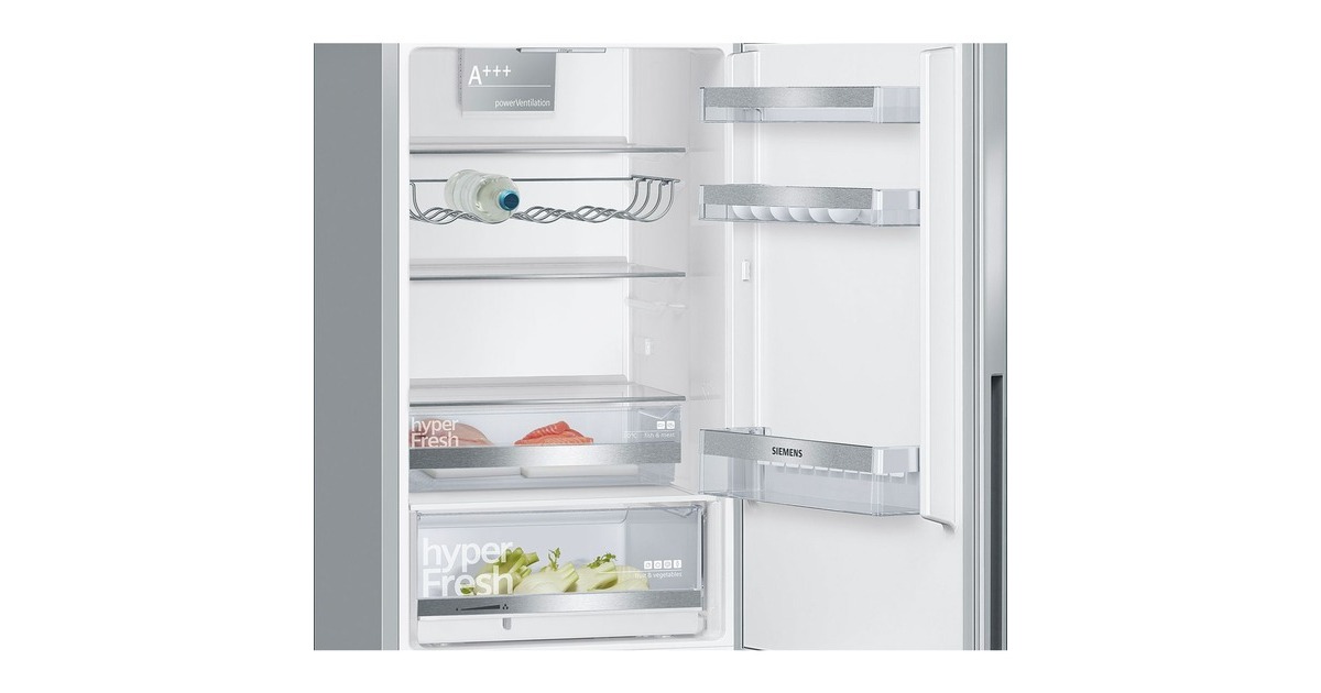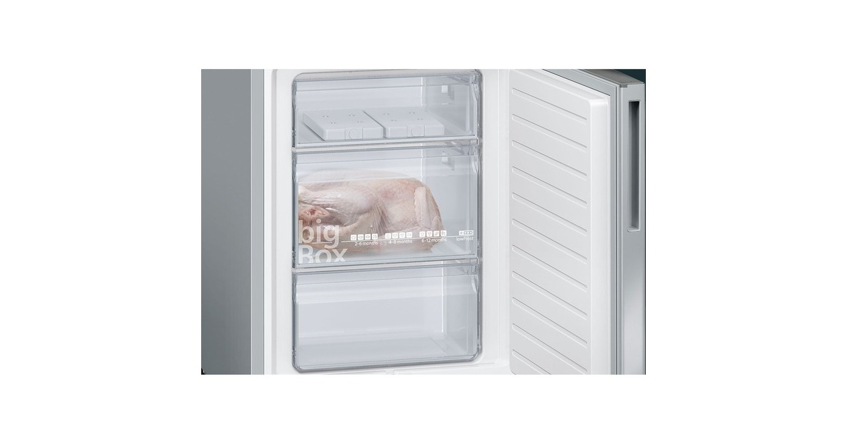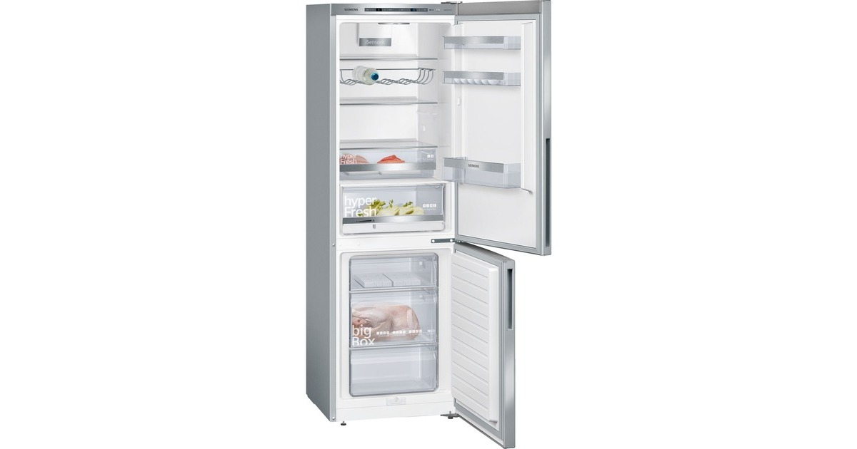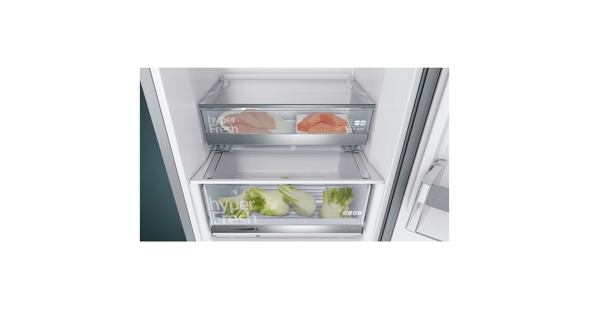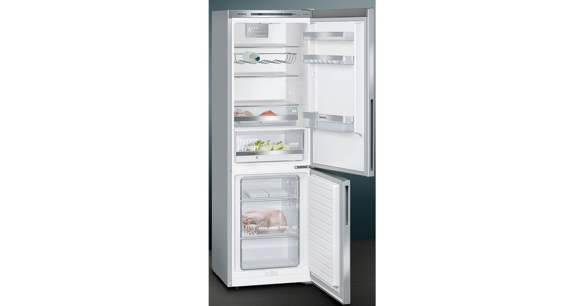 Die Kühl-/Gefrierkombination Siemens KG36EALCA ist mit einem Gesamtnutzinhalt von 308 Litern ideal für den mittelgroßen Haushalt geeignet. Im 214 Liter umfassende Kühlbereich haben frische Lebensmittel auf vier Abstellflächen aus Sicherheitsglas, davon zwei höhenverstell- und drei ausziehbar, in einer hyperFresh Obst-/Gemüseschublade mit Feuchteregelung und einer hyperFresh 0°C Box für Fisch und Fleisch sowie in drei Türfächern jede Menge Platz um übersichtlich gelagert zu werden. Mit der Taste superCooling werden die Temperaturen im Kühlraum schnell auf +2 °C gesenkt, was beim Einlagern von wärmeren Lebensmitteln in den Kühlraum einen unerwünschten Temperaturanstieg bereits gut gekühlter Speisen verhindert. Der Gefrierbereich der KG36EALCA umfasst 94 Liter und ist mit drei transparenten Gefriergutschubladen, davon eine BigBox, ausgestattet. LowFrost reduziert die Eisbildung, sodass man den Gefrierraum deutlich seltener abtauen muss. Die Temperaturregelung der KG36EALCA erfolgt getrennt für Kühl- und Gefrierbereich und ist digital exakt ablesbar. Mit einem Stromverbrauch von 149 kWh im Jahr ist die KG36EALCA in die Energieeffizienzklasse C eingestuft.Art.-Nr.: 1633213