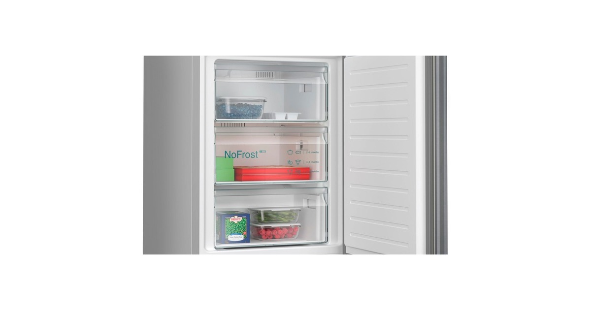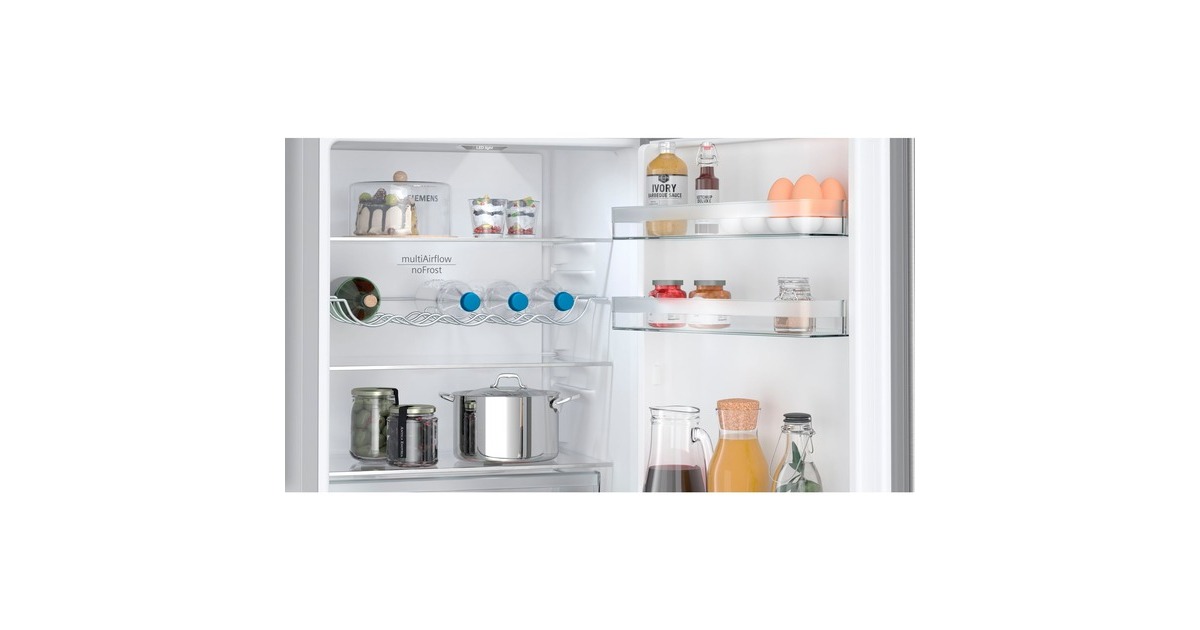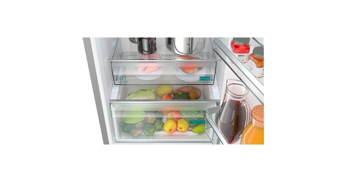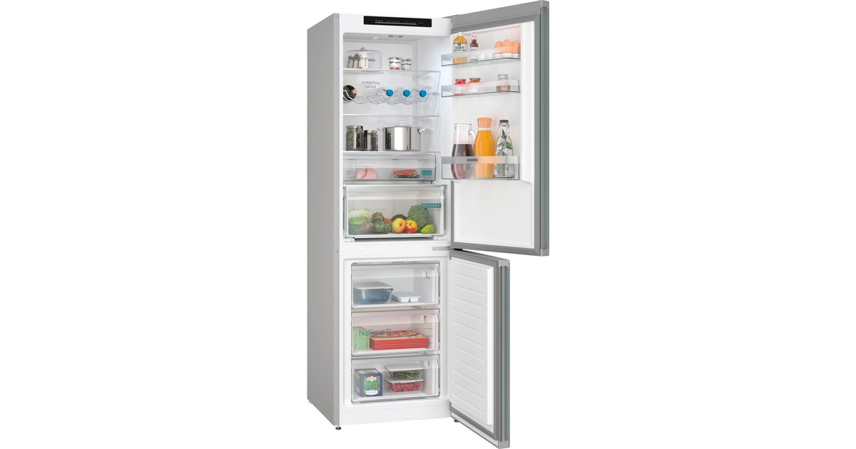 Die Kühl-/Gefrierkombination Siemens KG36N2LCF ist mit einem Gesamtnutzinhalt von 321 Litern ideal für den mittelgroßen Haushalt geeignet und bietet viel Komfort. Im 218 Liter umfassende Kühlbereich haben frische Lebensmittel auf vier Abstellflächen aus Sicherheitsglas, davon zwei höhenverstellbar, in einer hyperFresh Box für Obst und Gemüse und einer hyperFresh 0°C Box für Fisch und Fleisch sowie in drei Türfächern jede Menge Platz. Die superKühlen-Funktion kühlt neu eingelegte Lebensmittel schneller ab und bietet so Schutz für bereits eingelagerte Speisen. Der Gefrierbereich umfasst 103 Liter und ist mit drei transparenten Gefriergutschubladen ausgestattet. Dank der noFrost-Technologie gegen Eisbildung muss der Gefrierraum nie wieder mühsam abgetaut werden. Die Temperaturregelung der KG36N2LCF erfolgt elektronisch getrennt für jede Temperaturzone mittels und ist über LED ablesbar. Mit einem Stromverbrauch von 159 kWh im Jahr ist die KG36N2LCF in die Energieeffizienzklasse C eingestuft.Art.-Nr.: 1915950