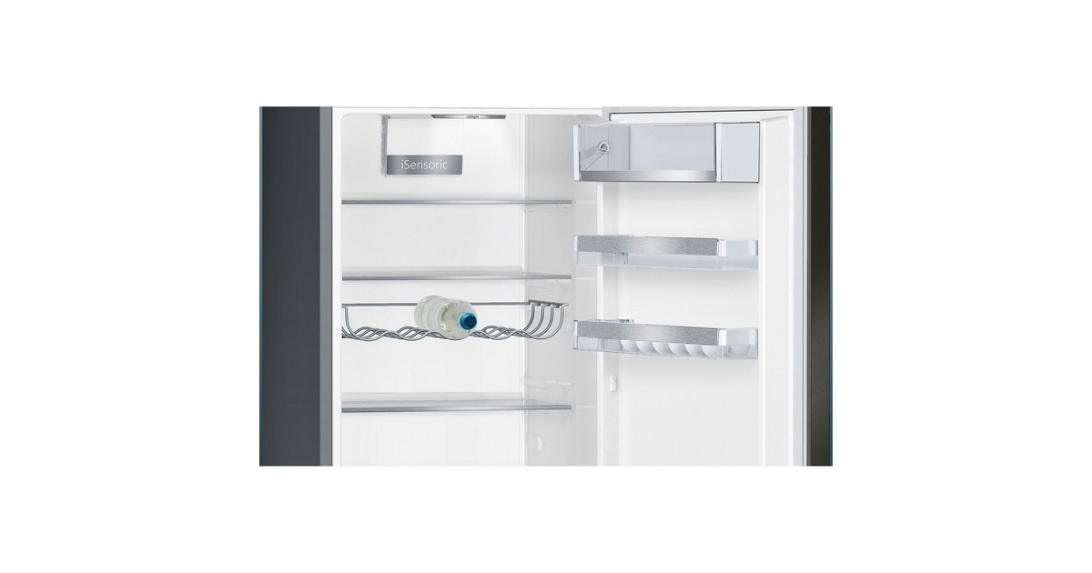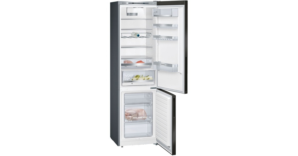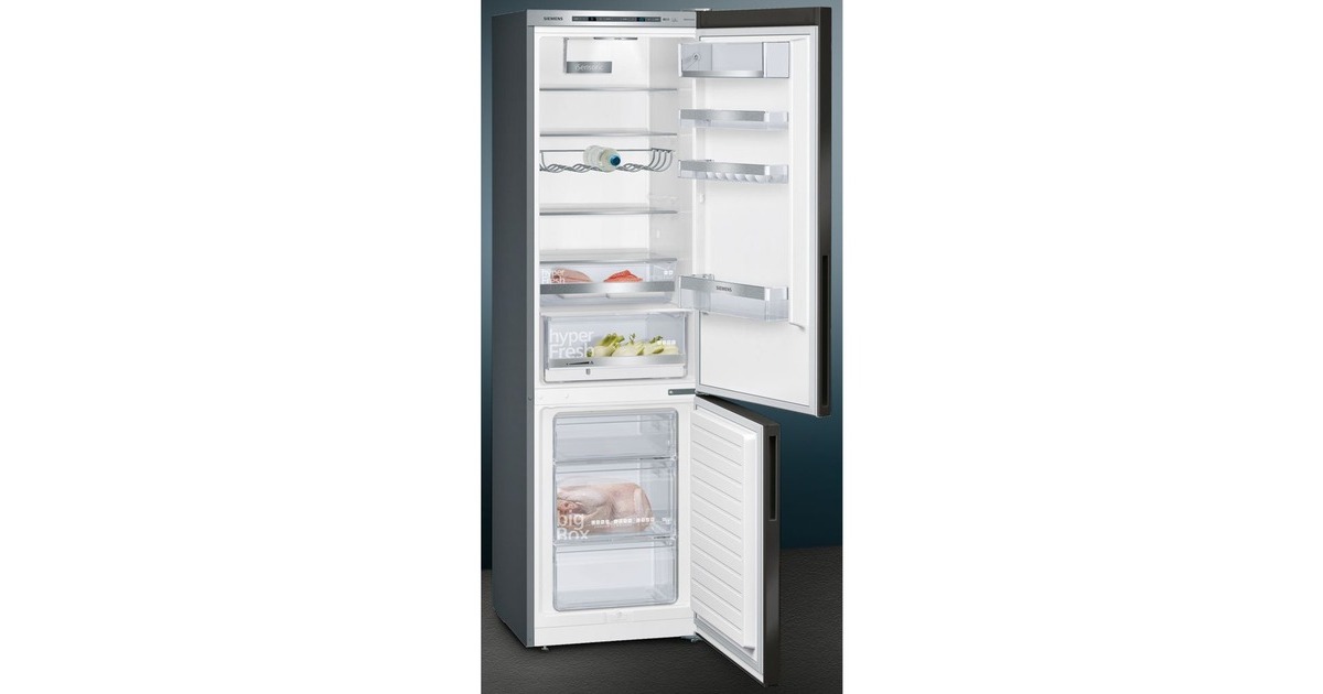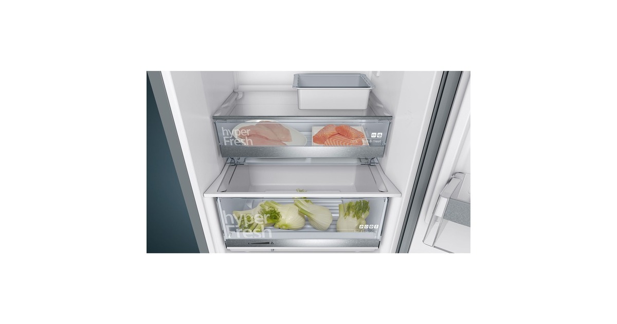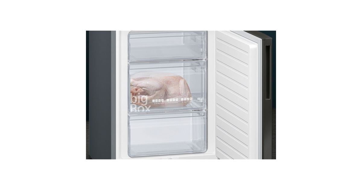 Die Kühl-/Gefrierkombination Siemens KG39E8XBA ist mit einem Gesamtnutzinhalt von 343 Litern ideal für den mittelgroßen Haushalt geeignet. Im 249 Liter umfassenden Kühlbereich haben frische Lebensmittel auf fünf Abstellflächen aus Sicherheitsglas, davon zwei höhenverstell- und vier ausziehbar, in einer hyperFresh Obst-/Gemüseschublade mit Feuchteregelung und einer hyperFresh 0°C Box für Fisch und Fleisch sowie in vier Türfächern jede Menge Platz um übersichtlich gelagert zu werden. Mit der Taste superCooling werden die Temperaturen im Kühlraum schnell auf +2 °C gesenkt, was beim Einlagern von wärmeren Lebensmitteln in den Kühlraum einen unerwünschten Temperaturanstieg bereits gut gekühlter Speisen verhindert. Der Gefrierbereich der KG39E8XBA umfasst 94 Liter und ist mit drei transparenten Gefriergutschubladen, davon eine BigBox, ausgestattet. LowFrost reduziert die Eisbildung, sodass man den Gefrierraum deutlich seltener abtauen muss. Die Temperaturregelung der KG39E8XBA erfolgt getrennt für Kühl- und Gefrierbereich und ist digital exakt ablesbar. Mit einem Stromverbrauch von 119 kWh im Jahr ist die KG39E8XBA in die Energieeffizienzklasse B eingestuft.Art.-Nr.: 1742300