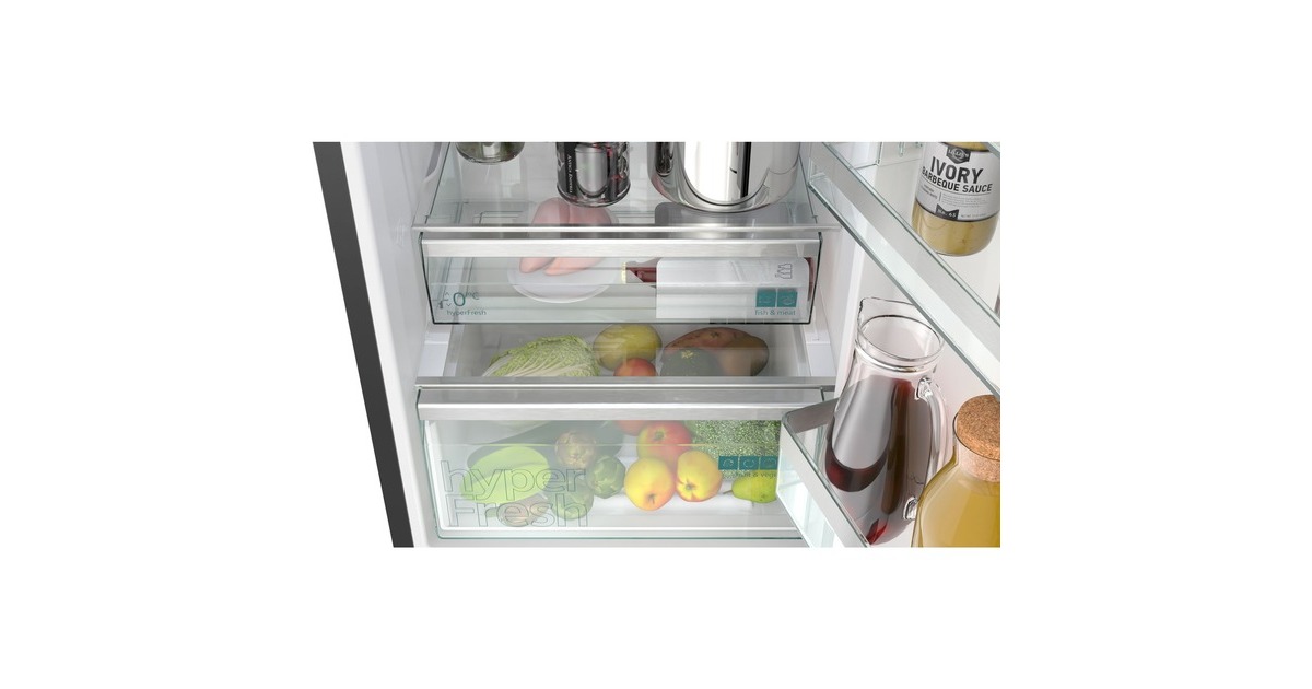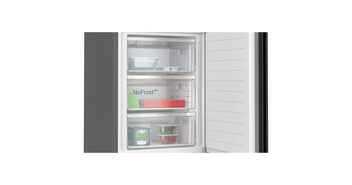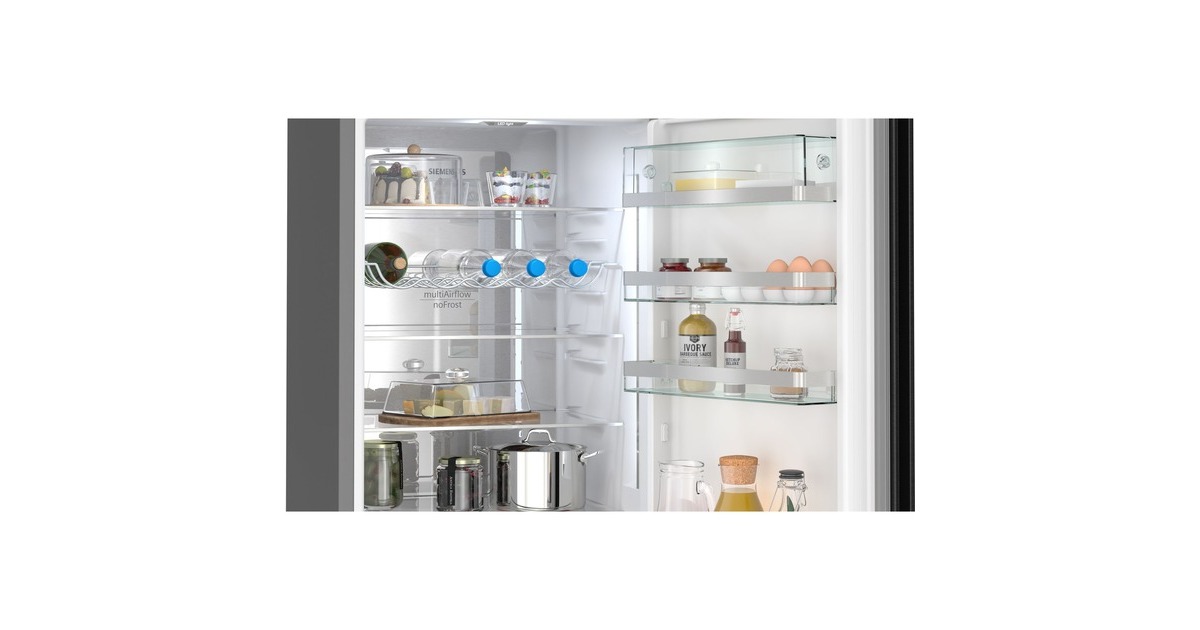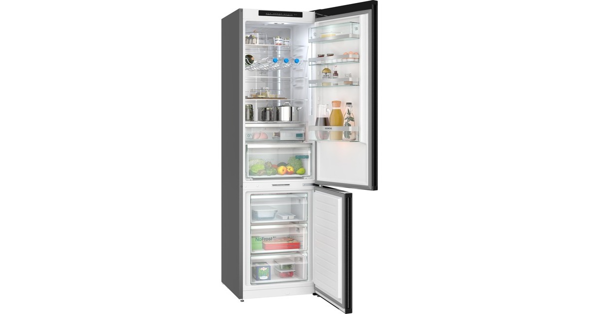 Die Kühl-/Gefrierkombination Siemens KG39NSBBF ist mit einem Gesamtnutzinhalt von 363 Litern ideal für den mittelgroßen Haushalt geeignet. Im 260 Liter umfassende Kühlbereich haben frische Lebensmittel auf fünf Abstellflächen aus Sicherheitsglas, davon drei höhenverstellbar, in einer hyperFresh Obst-/Gemüseschublade und einer hyperFresh 0°C Box für Fisch und Fleisch sowie in vier Türfächern jede Menge Platz, um übersichtlich gelagert zu werden. Mit der Taste superCooling werden die Temperaturen im Kühlraum schnell auf +2 °C gesenkt, was beim Einlagern von wärmeren Lebensmitteln in den Kühlraum einen unerwünschten Temperaturanstieg bereits gut gekühlter Speisen verhindert. Die Metallrückwand mit multiAirflow-System sorgt für gleichmäßig gekühlte Lebensmittel auf allen Ebenen. Der Gefrierbereich der KG39NSBBF umfasst 103 Liter und ist mit drei transparenten Gefriergutschubladen ausgestattet. NoFrost verhindert die Eisbildung, sodass man den Gefrierraum nie wieder mühsam abtauen muss, und das einzigartige LED-freezerLight-System leuchtet direkt in die geöffneten Gefrierschubladen, damit man alles in Sekunden findet. Die Temperaturregelung und Funktionssteuerung der KG39NSBBF erfolgt getrennt für Kühl- und Gefrierbereich. Mit einem Stromverbrauch von 129 kWh im Jahr ist die KG39NSBBF in die Energieeffizienzklasse B eingestuft.Art.-Nr.: 100033451