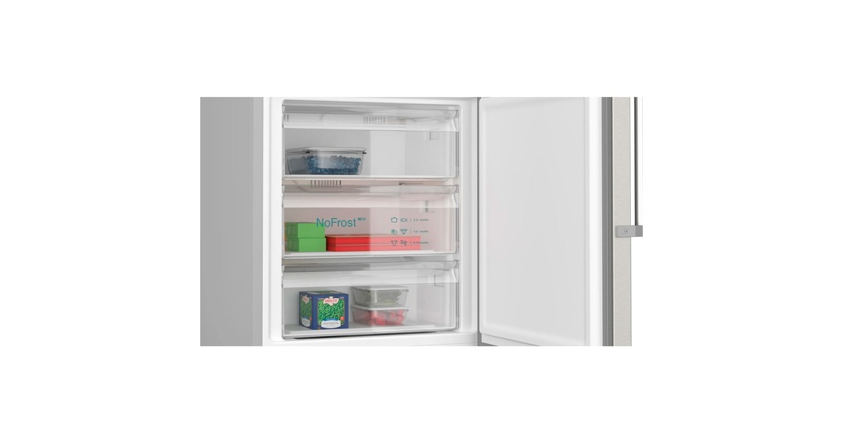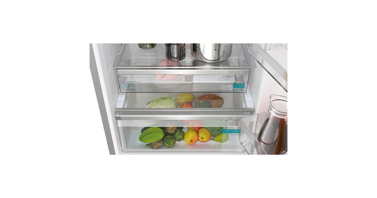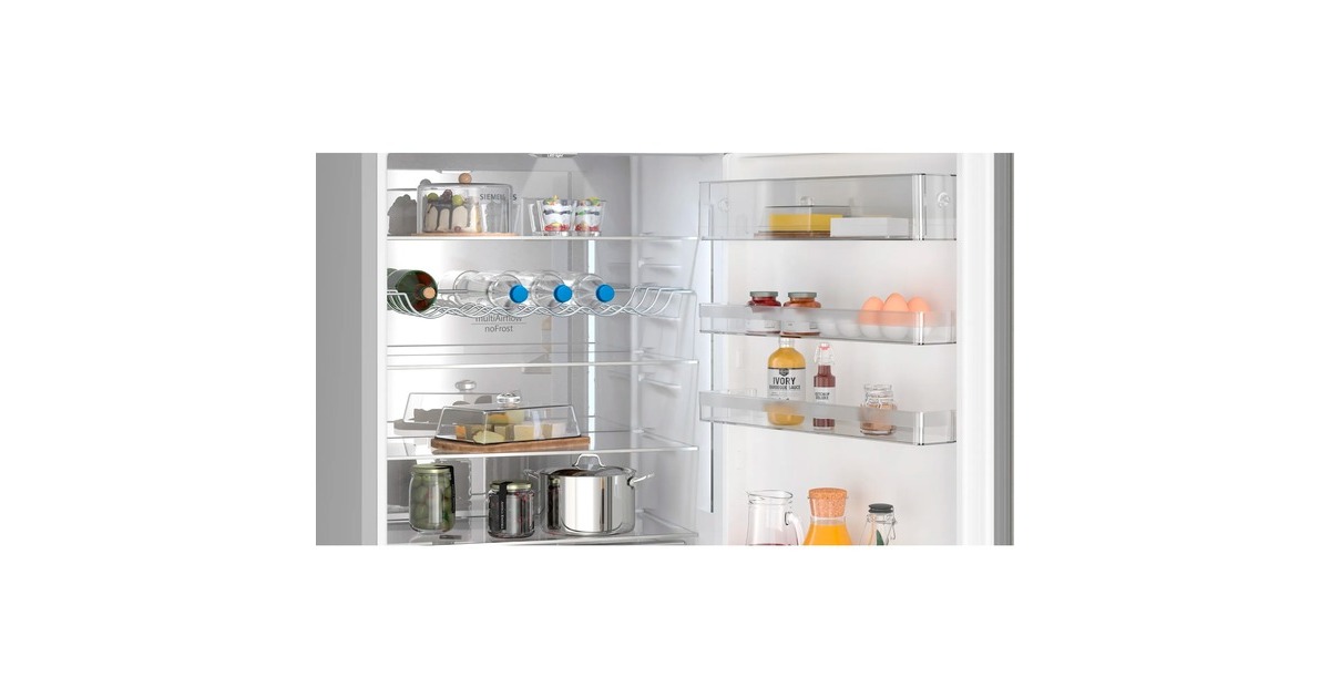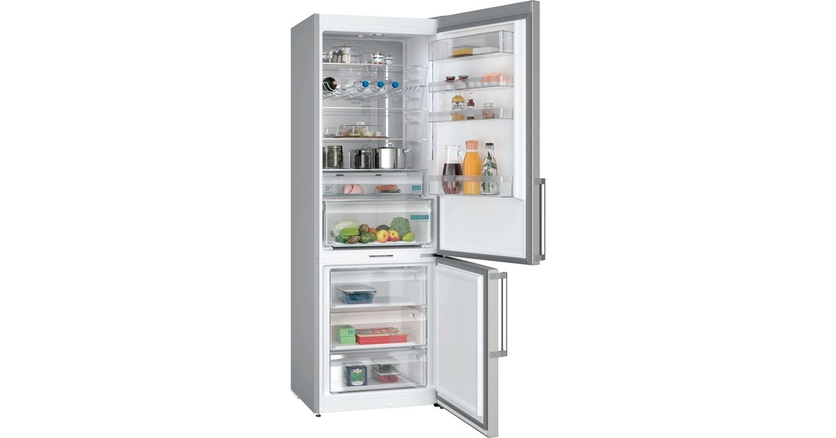 Die Kühl-/Gefrierkombination Siemens KG49NAICT ist mit einem Gesamtnutzinhalt von 440 Litern ideal für den großen Haushalt geeignet. Im 311 Liter umfassende Kühlbereich haben frische Lebensmittel auf fünf Abstellflächen aus Sicherheitsglas, davon drei höhenverstellbar, in einer hyperFresh Obst-/Gemüseschublade und einer hyperFresh 0°C Box für Fisch und Fleisch sowie in vier Türfächern jede Menge Platz, um übersichtlich gelagert zu werden. Mit der Taste superCooling werden die Temperaturen im Kühlraum schnell auf +2 °C gesenkt, was beim Einlagern von wärmeren Lebensmitteln in den Kühlraum einen unerwünschten Temperaturanstieg bereits gut gekühlter Speisen verhindert. Die Metallrückwand mit multiAirflow-System sorgt für gleichmäßig gekühlte Lebensmittel auf allen Ebenen. Der Gefrierbereich der KG49NAIBT umfasst 129 Liter und ist mit drei transparenten Gefriergutschubladen ausgestattet. NoFrost verhindert die Eisbildung, sodass man den Gefrierraum nie wieder mühsam abtauen muss, und das einzigartige LED-freezerLight-System leuchtet direkt in die geöffneten Gefrierschubladen, damit man alles in Sekunden findet. Die Temperaturregelung und Funktionssteuerung der KG49NAICT erfolgt getrennt für Kühl- und Gefrierbereich und ist von außen digital exakt ablesbar und dank Home Connect lässt sich das Gerät per App von überall aus steuern. Mit einem Stromverbrauch von 178 kWh im Jahr ist die KG49NAICT in die Energieeffizienzklasse C eingestuft.Art.-Nr.: 1899900