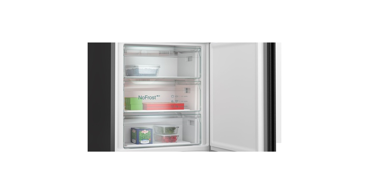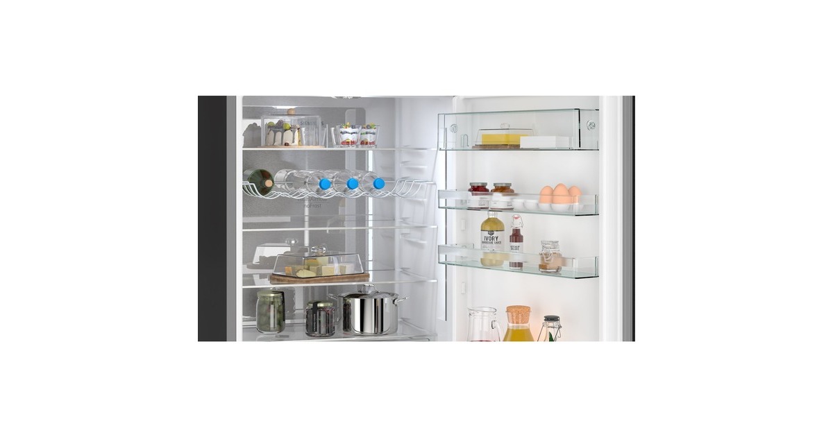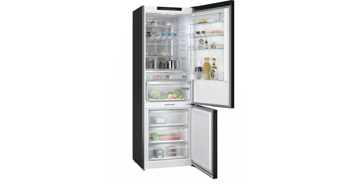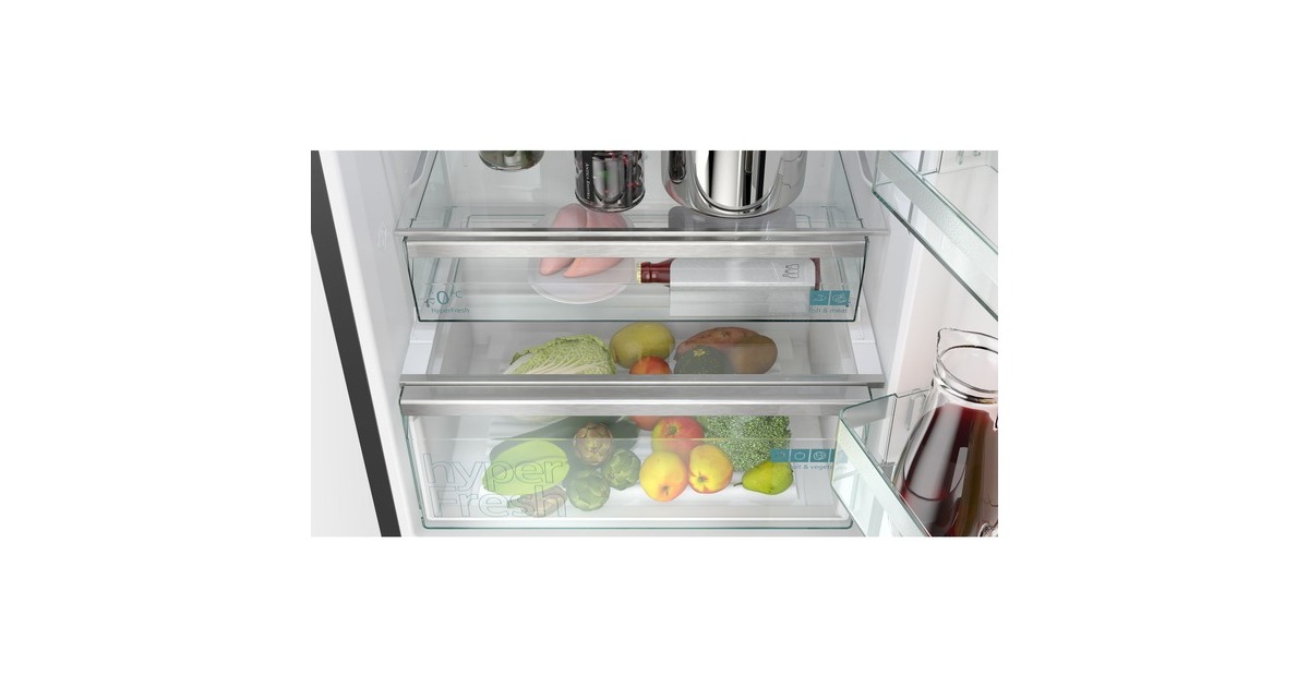 Die Kühl-/Gefrierkombination Siemens KG49NSBBF ist mit einem Gesamtnutzinhalt von 440 Litern ideal für den großen Haushalt geeignet. Im 311 Liter umfassende Kühlbereich haben frische Lebensmittel auf fünf Abstellflächen aus Sicherheitsglas, davon drei höhenverstellbar, in einer hyperFresh Obst-/Gemüseschublade und einer hyperFresh 0°C Box für Fisch und Fleisch sowie in vier Türfächern jede Menge Platz, um übersichtlich gelagert zu werden. Mit der Taste superCooling werden die Temperaturen im Kühlraum schnell auf +2 °C gesenkt, was beim Einlagern von wärmeren Lebensmitteln in den Kühlraum einen unerwünschten Temperaturanstieg bereits gut gekühlter Speisen verhindert. Die Metallrückwand mit multiAirflow-System sorgt für gleichmäßig gekühlte Lebensmittel auf allen Ebenen. Der Gefrierbereich der KG49NSBBF umfasst 129 Liter und ist mit drei transparenten Gefriergutschubladen ausgestattet. NoFrost verhindert die Eisbildung, sodass man den Gefrierraum nie wieder mühsam abtauen muss, und das einzigartige LED-freezerLight-System leuchtet direkt in die geöffneten Gefrierschubladen, damit man alles in Sekunden findet. Die Temperaturregelung und Funktionssteuerung der KG49NSBBF erfolgt getrennt für Kühl- und Gefrierbereich. Mit einem Stromverbrauch von 142 kWh im Jahr ist die KG49NSBBF in die Energieeffizienzklasse B eingestuft.Art.-Nr.: 100033455