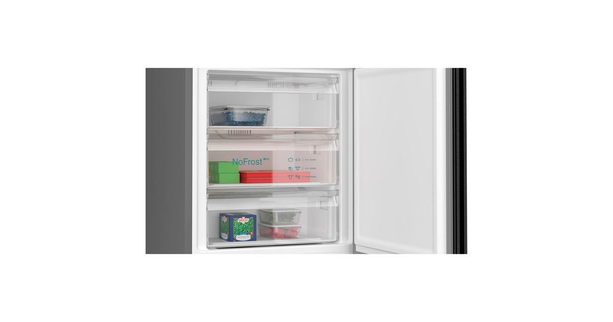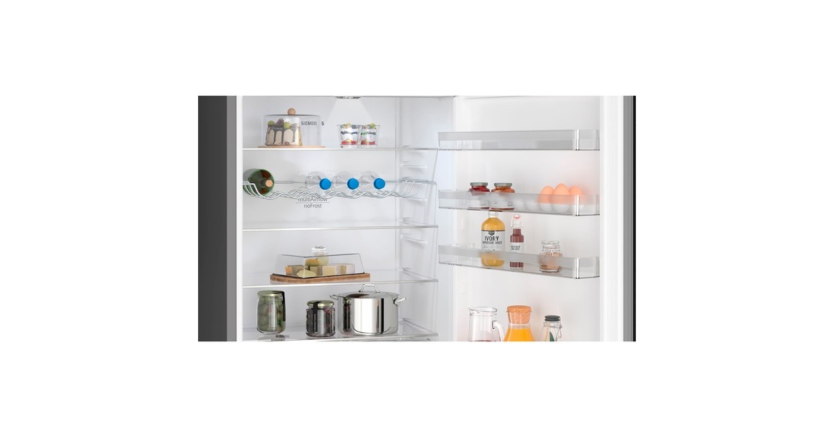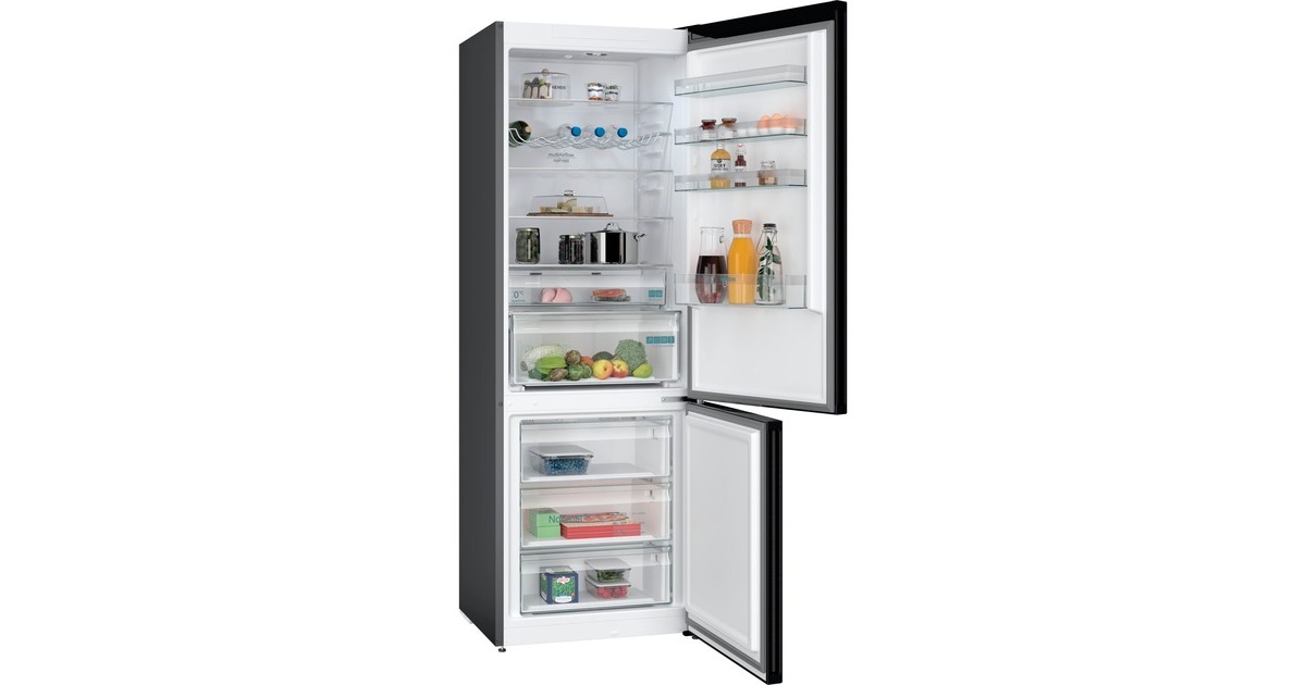 Die Kühl-/Gefrierkombination Siemens KG49NXXCF ist mit einem Gesamtnutzinhalt von 440 Litern ideal für den großen Haushalt geeignet. Im 311 Liter umfassende Kühlbereich haben frische Lebensmittel auf fünf Abstellflächen aus Sicherheitsglas, davon drei höhenverstellbar, in einer hyperFresh Obst-/Gemüseschublade mit Feuchteregelung und einer hyperFresh 0°C Box für Fisch und Fleisch sowie in vier Türfächern jede Menge Platz, um übersichtlich gelagert zu werden. Mit der Taste superCooling werden die Temperaturen im Kühlraum schnell auf +2 °C gesenkt, was beim Einlagern von wärmeren Lebensmitteln in den Kühlraum einen unerwünschten Temperaturanstieg bereits gut gekühlter Speisen verhindert. Der Gefrierbereich der KG49NXXCF umfasst 129 Liter und ist mit drei transparenten Gefriergutschubladen ausgestattet. NoFrost verhindert die Eisbildung, sodass man den Gefrierraum nie wieder mühsam abtauen muss. Die Temperaturregelung und Funktionssteuerung der KG49NXXCF erfolgt getrennt für Kühl- und Gefrierbereich und ist von außen digital exakt ablesbar. Mit einem Stromverbrauch von 178 kWh im Jahr ist die KG49NXIBF in die Energieeffizienzklasse C eingestuft.Art.-Nr.: 1899901