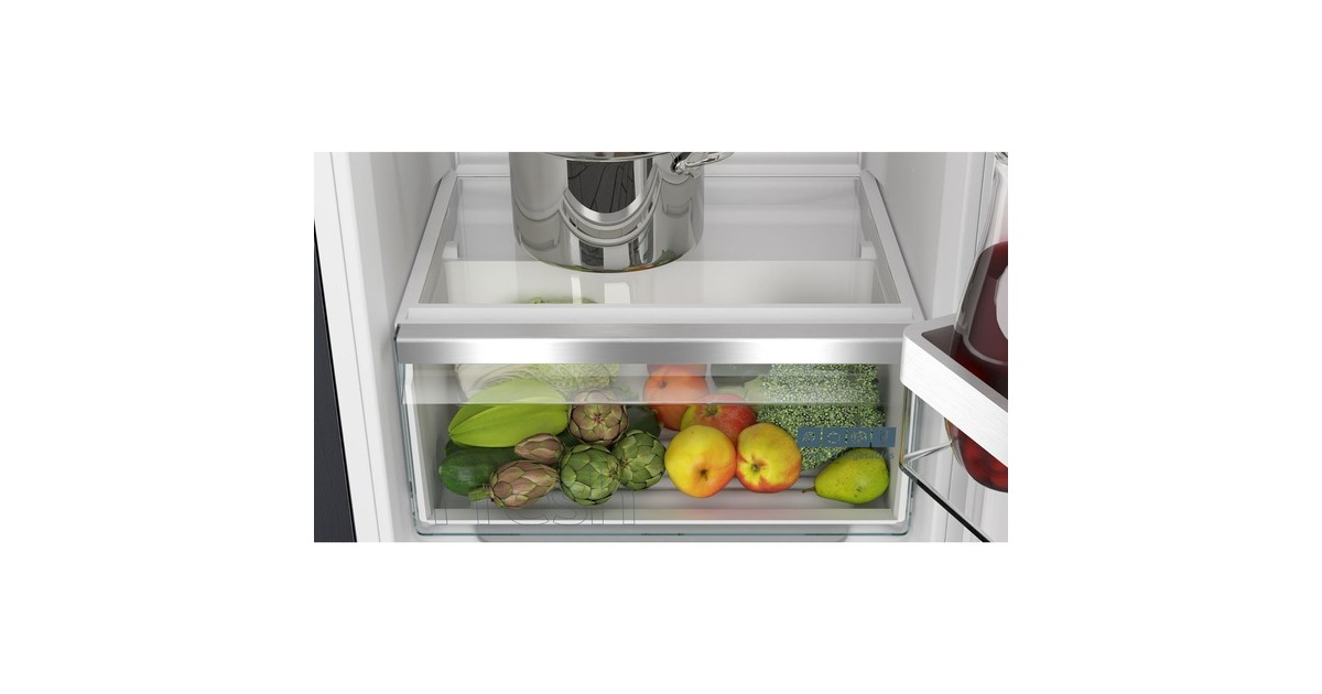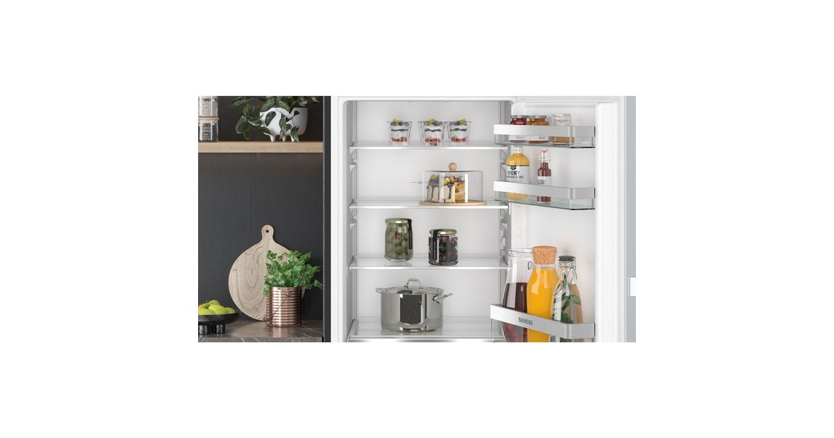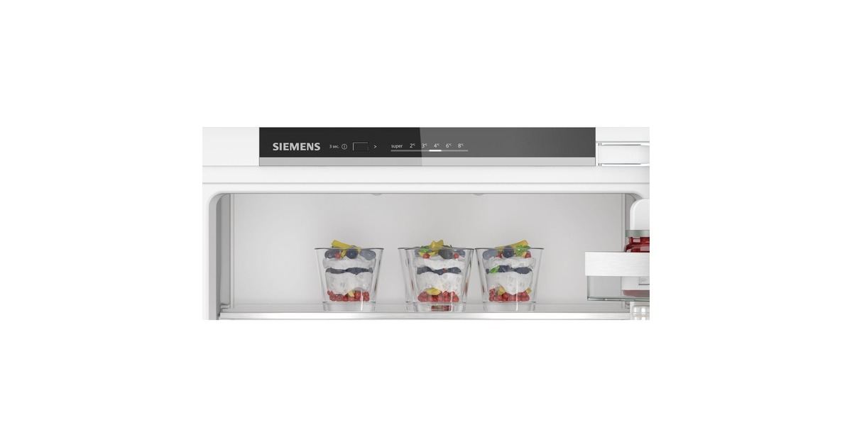 Der Vollraumkühlschrank Siemens KI31R2FE0 bietet einen Gesamtnutzinhalt von 165 Litern und lässt sich perfekt in Nischen mit einer Höhe von 1025 mm integrieren. Ausgestattet ist er mit vier Abstellflächen aus Sicherheitsglas, davon drei höhenverstellbar, einer Obst-/Gemüseschublade mit Wellenboden sowie drei Türfächern. Das autoAirflow-System verteilt die Luft gleichmäßig im Innenraum und sorgt damit für eine konstante Temperatur auf allen Ebenen. Mit der SuperKühlen-Funktion wird die Temperatur für eine eingestellte Zeit gesenkt, sodass beim Einlagern wärmerer Lebensmittel ein unerwünschter Temperaturanstieg bereits gekühlter Speisen verhindert wird. Mit einem Stromverbrauch von 96 kWh im Jahr ist der KI31R2FE0 in die Energieeffizienzklasse E eingestuft.Art.-Nr.: 1871574