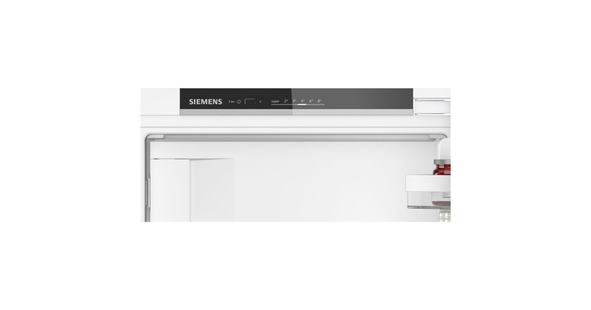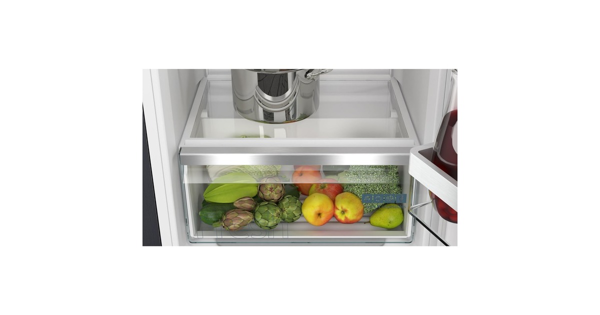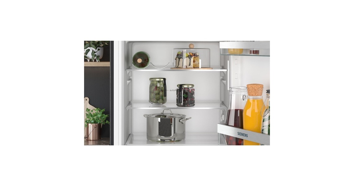 Der Kühlschrank Siemens KI32LVFE0 bietet einen Gesamtnutzinhalt von 147 Litern und lässt sich perfekt in Nischen mit einer Höhe von 1025 mm integrieren. Ausgestattet ist er mit drei Abstellflächen aus Sicherheitsglas, davon zwei höhenverstellbar, einer Obst-/Gemüseschublade mit Wellenboden sowie drei Türfächern. Das autoAirflow-System verteilt die Luft gleichmäßig im Innenraum und sorgt damit für eine konstante Temperatur auf allen Ebenen. Mit der SuperKühlen-Funktion wird die Temperatur für eine eingestellte Zeit gesenkt, sodass beim Einlagern wärmerer Lebensmittel ein unerwünschter Temperaturanstieg bereits gekühlter Speisen verhindert wird. Das 4-Sterne-Gefrierfach mit Klappe bietet einen Nutzinhalt von 15 Litern und friert innerhalb von 24 Stunden bis zu 3 Kilogramm an Lebensmitteln ein. Mit einem Stromverbrauch von 145 kWh im Jahr ist der KI32LVFE0 in die Energieeffizienzklasse E eingestuft.Art.-Nr.: 1871563