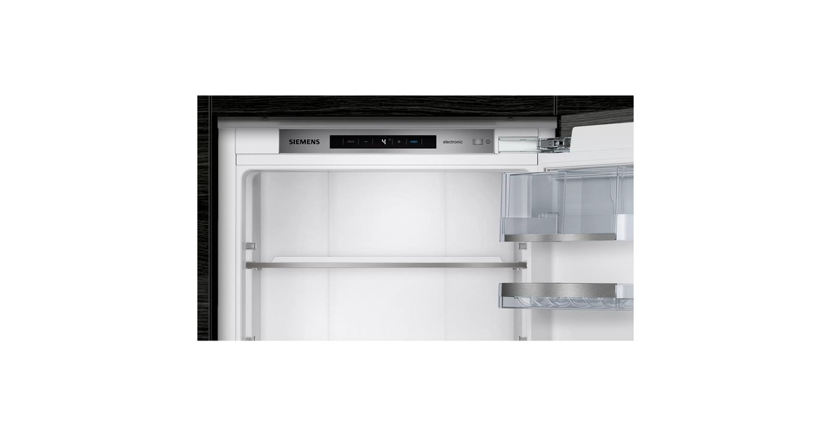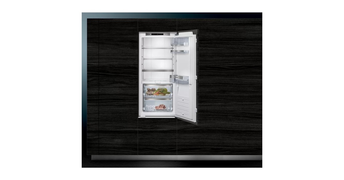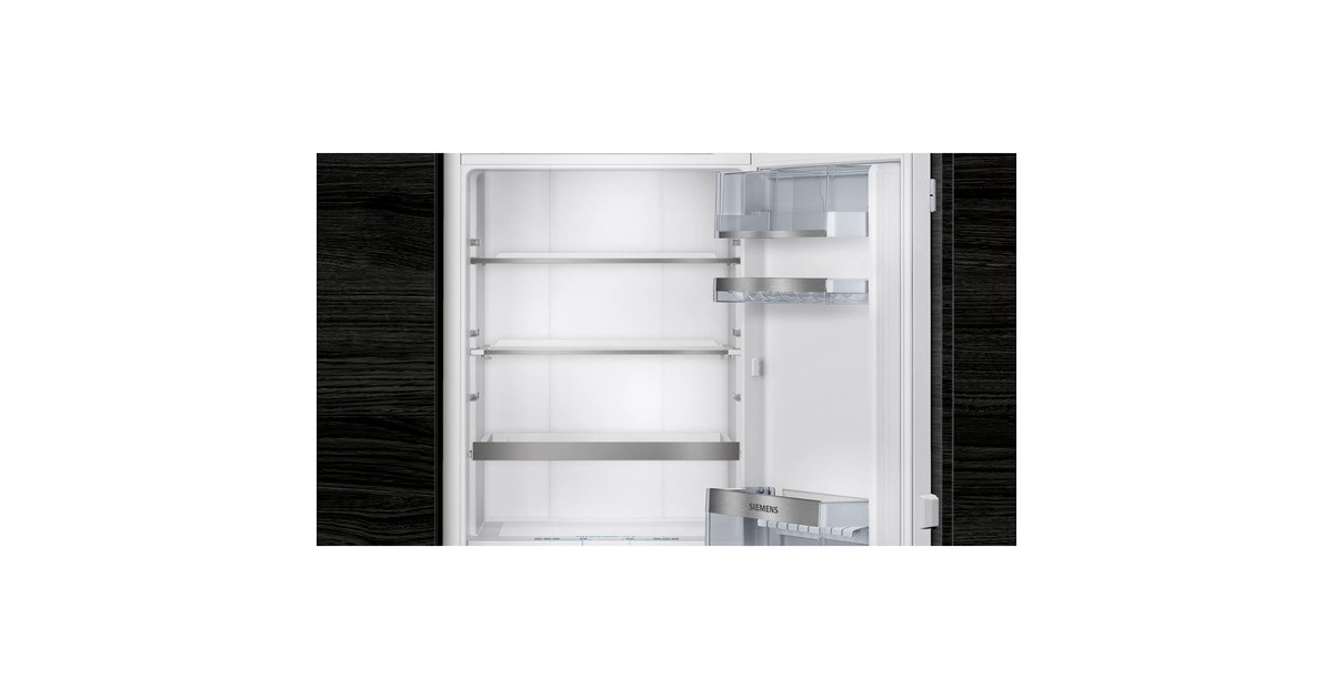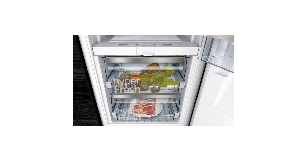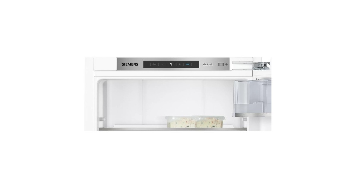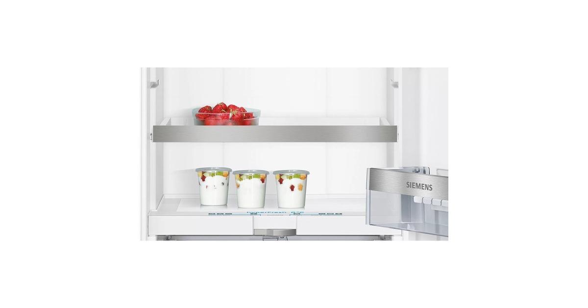 Der vollintegrierbare Kühlschrank Siemens KI41FADD0 stellt einen Gesamtnutzinhalt von 187 Litern zur übersichtlichen Lagerung frischer Lebensmittel zur Verfügung. Er ist mit vier Abstellflächen aus Sicherheitsglas, davon drei höhenverstellbar und eine ausziehbar, sowie drei Türfächern, davon ein Butter-/Käsefach, ausgestattet. Zwei hyperFresh premium 0°C Boxen - eine für Obst und Gemüse und eine für Fisch und Fleisch - kombinieren optimale Feuchtigkeitsregulierung und konstante Temperatur, um Lebensmittel bis zu dreimal länger frisch und knackig zu halten. Die intelligente Sensortechnik FreshSense sorgt im gesamten Kühlraum für eine konstante Temperatur und dank der softClosing-Tür ist der KI41FADD0 stets ordnungsgemäß und vollständig geschlossen. Mit der SuperKühlen-Funktion wird die Temperatur für eine eingestellte Zeit gesenkt, sodass beim Einlagern wärmerer Lebensmittel ein unerwünschter Temperaturanstieg bereits gekühlter Speisen verhindert wird. Mit einem Stromverbrauch von 110 kWh im Jahr ist der KI41FADD0 in die Energieeffizienzklasse D eingestuft.Art.-Nr.: 1665762