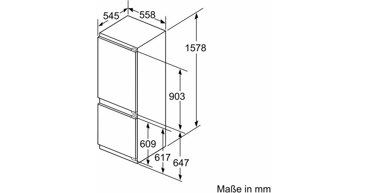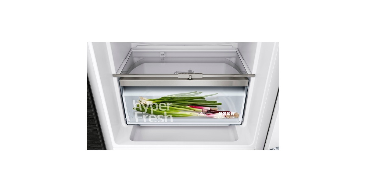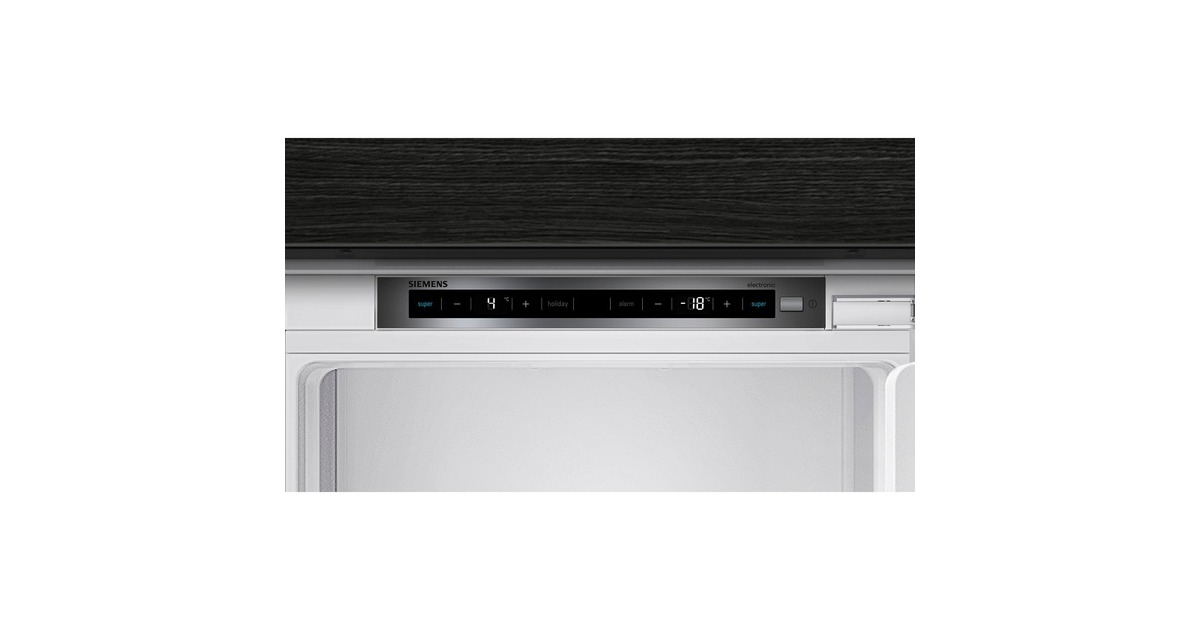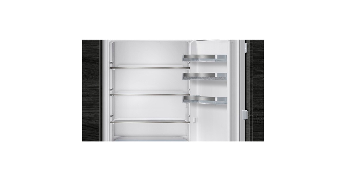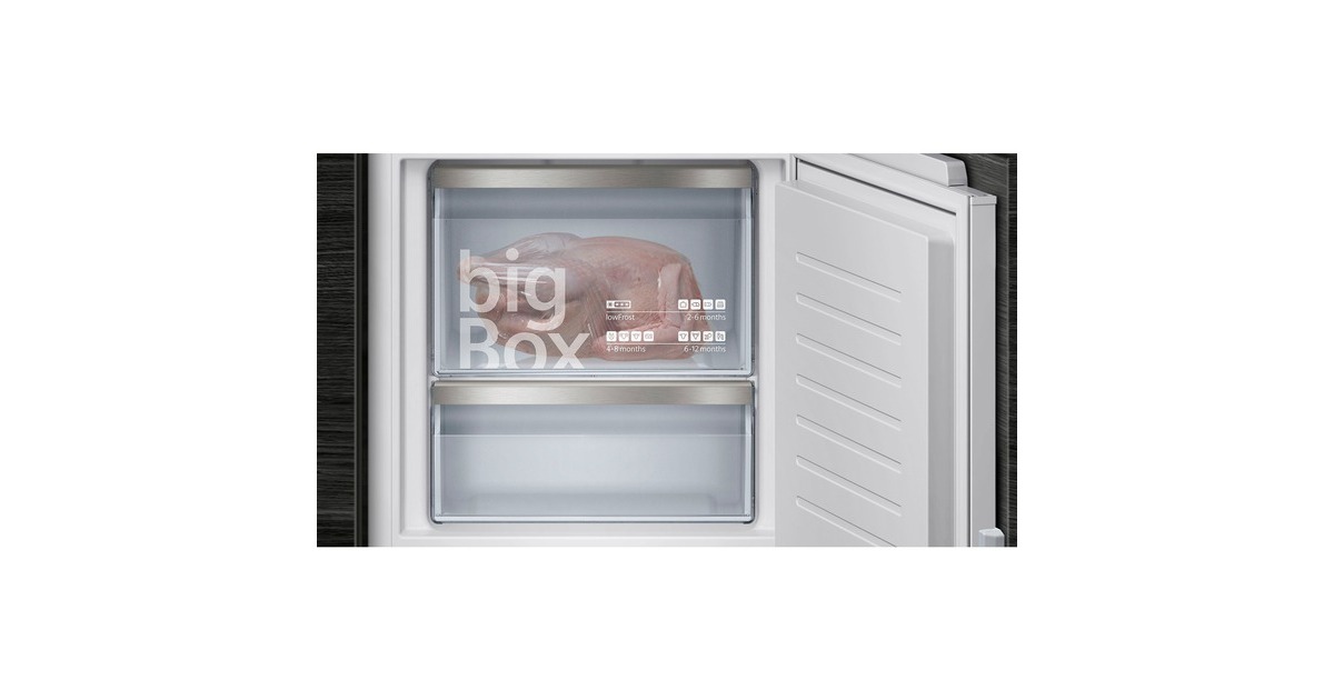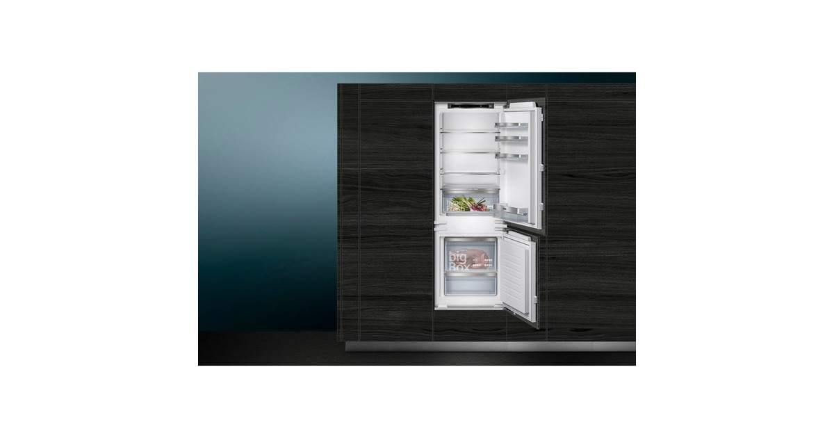 Die vollintegrierbare Kühl-/Gefrierkombination Siemens KI77SXFE0 stellt einen Gesamtnutzinhalt von 231 Litern zur übersichtlichen Lagerung frischer Lebensmittel zur Verfügung und bietet viel Komfort. Der 169 Liter fassende Kühlraum ist mit vier Abstellflächen aus Sicherheitsglas, davon drei höhenverstellbar, sowie vier Türfächern, davon ein Butter-/Käsefach, ausgestattet. Die hyperFresh plus Box mit Feuchteregelung hält Obst und Gemüse bis zu zweimal länger frisch. Mit der SuperKühlen-Funktion wird die Temperatur im Kühlraum für eine eingestellte Zeit gesenkt, sodass beim Einlagern wärmerer Lebensmittel ein unerwünschter Temperaturanstieg bereits gekühlter Speisen verhindert wird. Der flexibel nutzbare Gefrierbereich der KI77SXFE0 umfasst 62 Liter und stellt zwei transparente Gefriergutschubladen zur Verfügung, davon eine bigBox um großes Gefriergut optimal zu lagern und zu stapeln. Die geringere Eisbildung durch die LowFrost-Technologie spart Energie und Arbeit beim Abtauen und die intelligente Sensortechnik FreshSense sorgt im gesamten Kühlschrank für eine konstante Temperatur. Mit einem Stromverbrauch von 207 kWh im Jahr ist die KI77SXFE0 in die Energieeffizienzklasse E eingestuft.Art.-Nr.: 100022866
