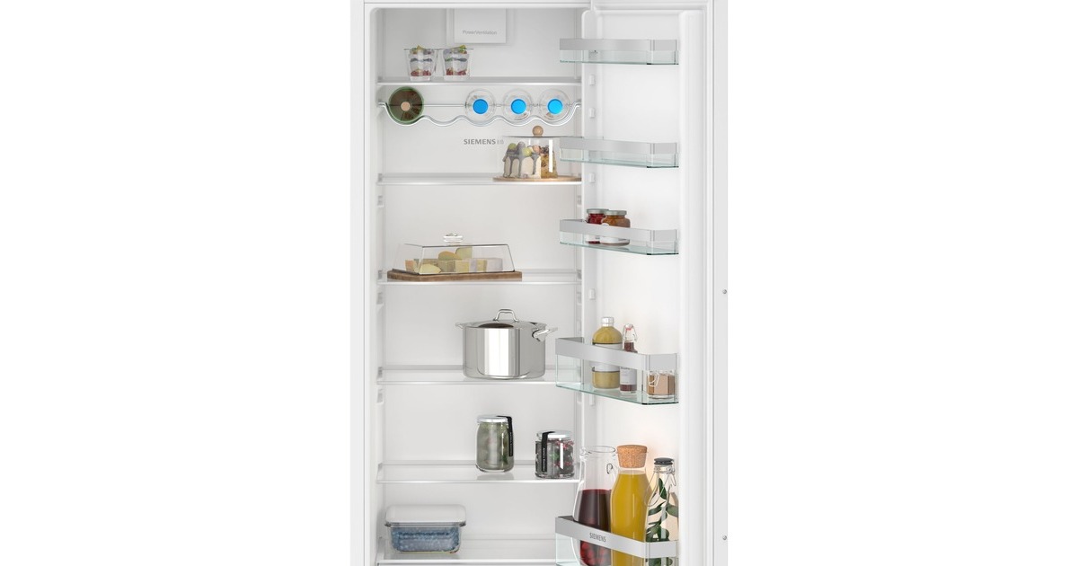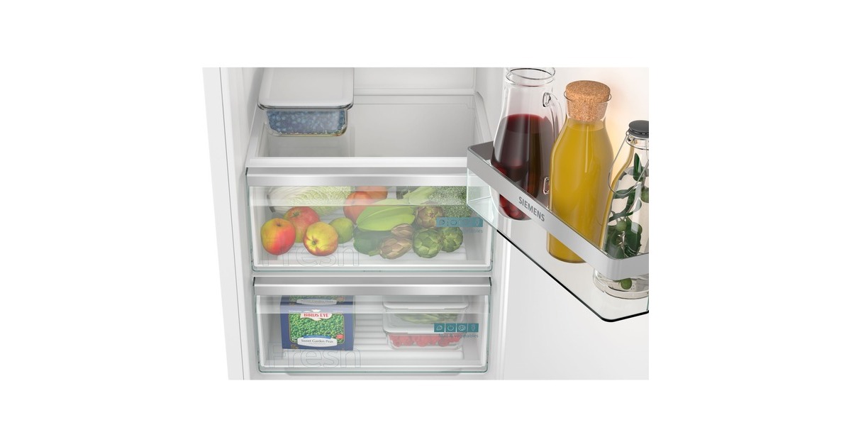 Der Vollraumkühlschrank Siemens KI81RVFE0 bietet einen Gesamtnutzinhalt von 310 Litern und lässt sich perfekt in Nischen mit einer Höhe von 1775 mm integrieren. Ausgestattet ist er mit sieben Abstellflächen aus Sicherheitsglas, davon fünf höhenverstellbar, zwei Obst-/Gemüseschubladen sowie fünf Türfächern. Mit der SuperKühlen-Funktion wird die Temperatur im KI81RVFE0 für eine eingestellte Zeit gesenkt, sodass beim Einlagern wärmerer Lebensmittel ein unerwünschter Temperaturanstieg bereits gekühlter Speisen verhindert wird. Mit einem Stromverbrauch von 114 kWh im Jahr ist der KI81RVFE0 in die Energieeffizienzklasse E eingestuft.Art.-Nr.: 100022862