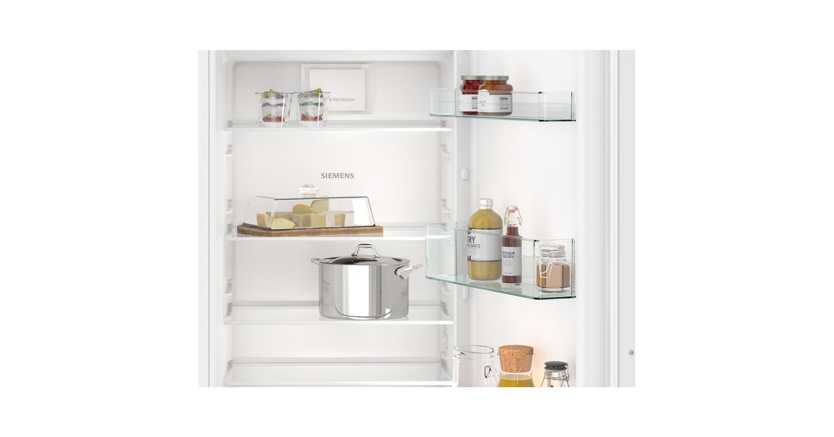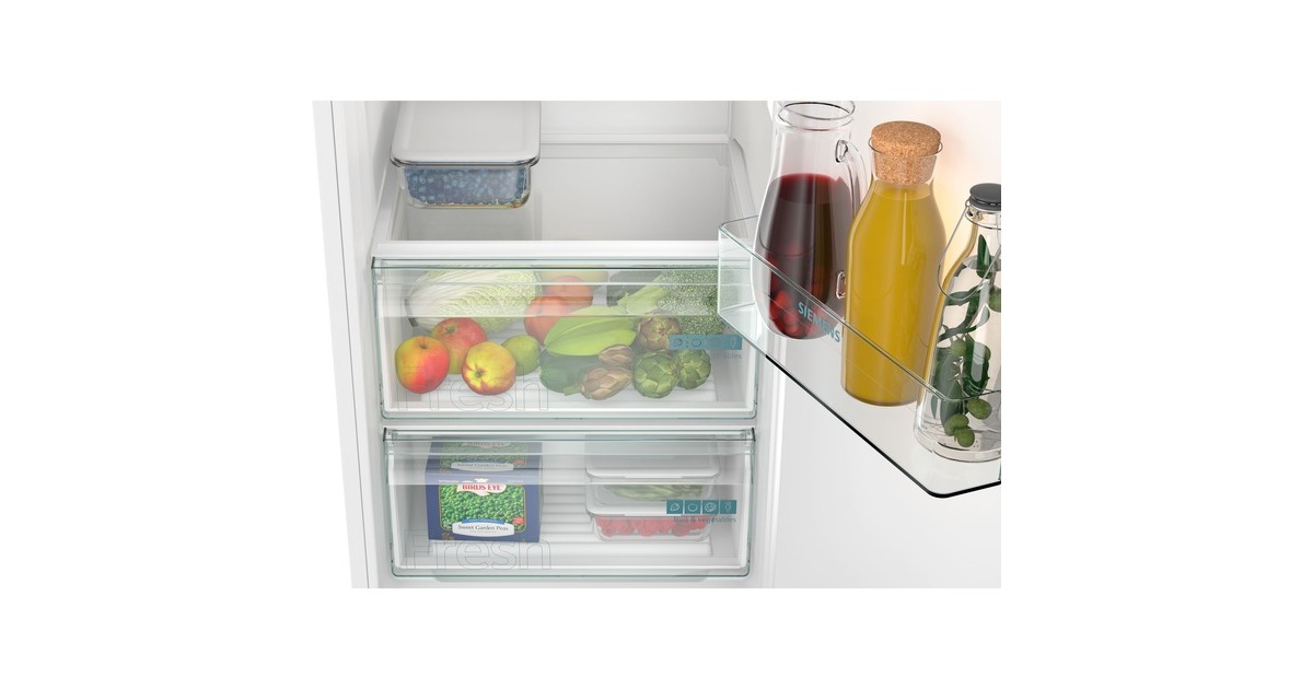 Der Kühlschrank Siemens KI82LNSE0 bietet einen Gesamtnutzinhalt von 280 Litern und lässt sich perfekt in Nischen mit einer Höhe von 1775 mm integrieren. Ausgestattet ist er mit sieben Abstellflächen aus Sicherheitsglas, davon fünf höhenverstellbar, zwei Obst-/Gemüseschubladen mit Wellenboden sowie fünf Türfächern. Mit der SuperKühlen-Funktion wird die Temperatur für eine eingestellte Zeit gesenkt, sodass beim Einlagern wärmerer Lebensmittel ein unerwünschter Temperaturanstieg bereits gekühlter Speisen verhindert wird. Das 4-Sterne-Gefrierfach mit Klappe bietet einen Nutzinhalt von 34 Litern und friert innerhalb von 24 Stunden bis zu 2,5 Kilogramm an Lebensmitteln ein. Eine SuperGefrieren-Funktion ist ebenfalls vorhanden. Mit einem Stromverbrauch von 177 kWh im Jahr ist der KI82LNSE0 in die Energieeffizienzklasse E eingestuft.Art.-Nr.: 100034198