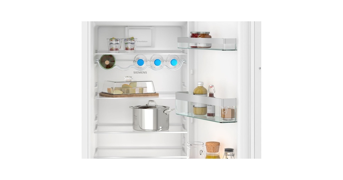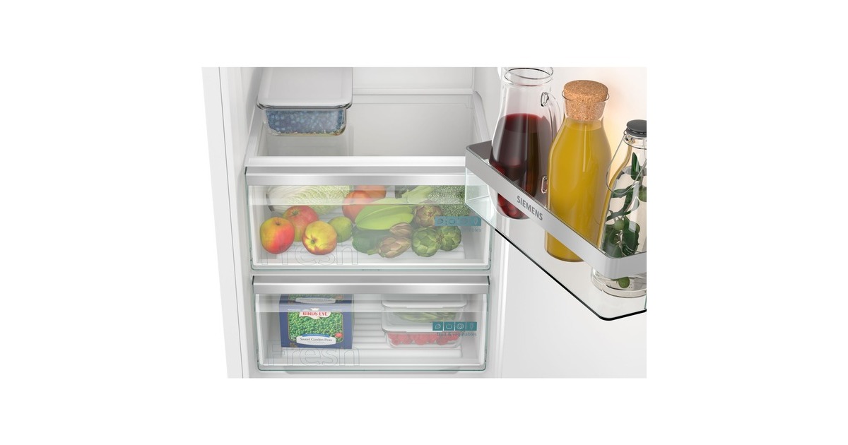 Der Kühlschrank Siemens KI82LVFE0 bietet einen Gesamtnutzinhalt von 280 Litern und lässt sich perfekt in Nischen mit einer Höhe von 1775 mm integrieren. Ausgestattet ist er mit sieben Abstellflächen aus Sicherheitsglas, davon fünf höhenverstellbar, zwei Obst-/Gemüseschubladen mit Wellenboden sowie fünf Türfächern. Mit der SuperKühlen-Funktion wird die Temperatur für eine eingestellte Zeit gesenkt, sodass beim Einlagern wärmerer Lebensmittel ein unerwünschter Temperaturanstieg bereits gekühlter Speisen verhindert wird. Das 4-Sterne-Gefrierfach mit Klappe bietet einen Nutzinhalt von 34 Litern und friert innerhalb von 24 Stunden bis zu 2,5 Kilogramm an Lebensmitteln ein. Eine SuperGefrieren-Funktion ist ebenfalls vorhanden. Mit einem Stromverbrauch von 177 kWh im Jahr ist der KI82LVFE0 in die Energieeffizienzklasse E eingestuft.Art.-Nr.: 100034241