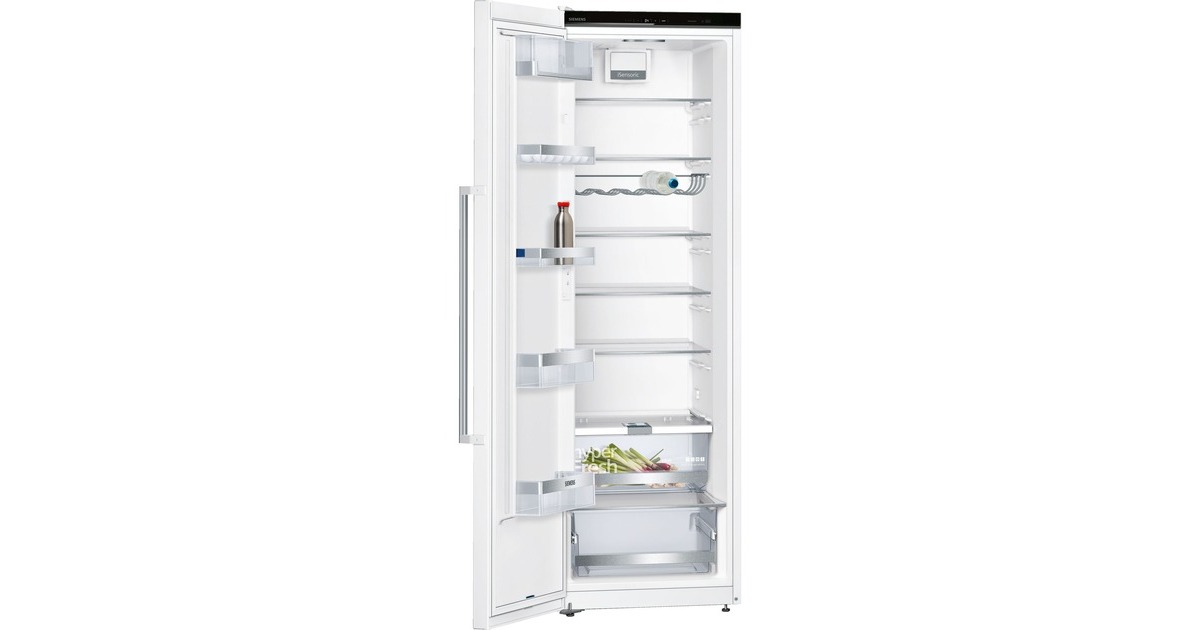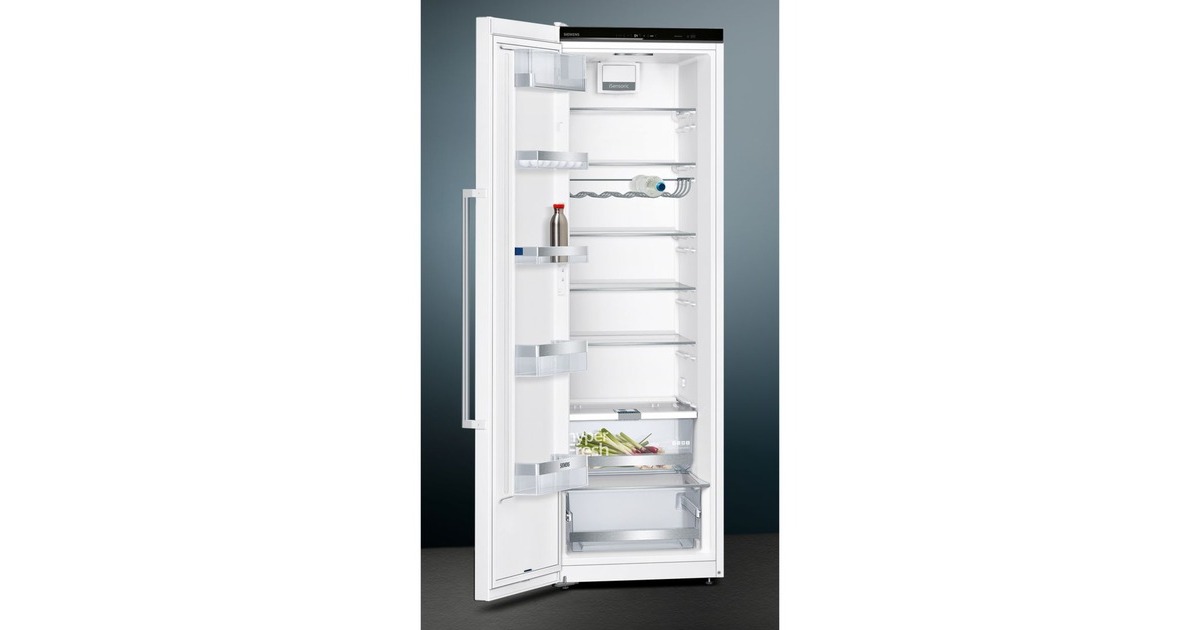 Der Kühlschrank Siemens KS36VAWEP stellt einen groszügigen Gesamtnutzinhalt von 346 Litern zur übersichtlichen Lagerung frischer Lebensmittel zur Verfügung und bietet viel Komfort. Ausgestattet ist er mit sieben Abstellflächen aus Sicherheitsglas, davon vier höhenverstell- und fünf ausziehbar, einem verchromten Flaschenrost sowie vier Türfächern. Die hyperFresh plus Box mit Feuchteregelung hält Obst und Gemüse bis zu zweimal länger frisch und die Fresh Box lässt sich dank der Teleskopschienen bequem ausziehen. Die intelligente Sensortechnik freshSense sorgt im gesamten Kühlraum für eine konstante Temperatur und mit der SuperKühlen-Funktion wird die Temperatur für eine eingestellte Zeit gesenkt, damit beim Einlagern wärmerer Lebensmittel ein unerwünschter Temperaturanstieg bereits gekühlter Speisen verhindert wird. Mit einem Stromverbrauch von 116 kWh im Jahr ist der KS36VAWEP in die Energieeffizienzklasse E eingestuft.Art.-Nr.: 1690770