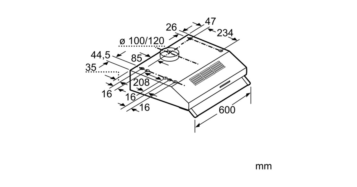 60 cm Unterbauesse; Stufenlos verstellbarer Luftleitschirm aus Glas |