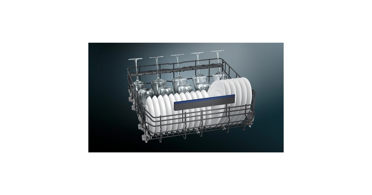 Höhenverstellbar mit rackMatic (3-stufig), Leichtlaufrollen, 2x Umklappbare Stachelreihen, Tassenablage (2-teilig), Gläseranlagebügel mit blauen Antirutsch-Applikationen im Oberkorb |