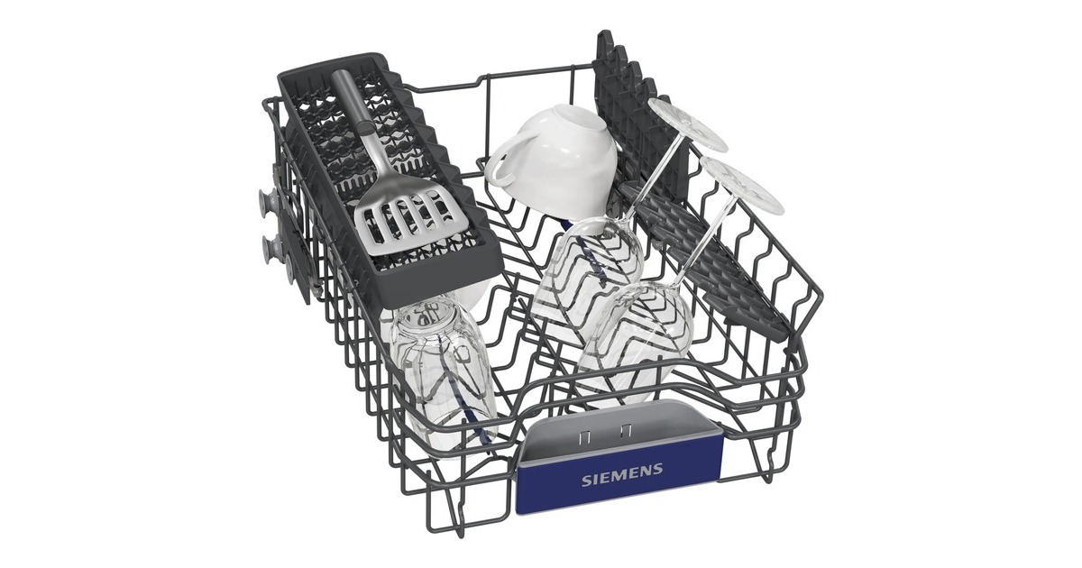Komfortrollen, Korbstopper, 2x Umklappbare Klappstachelreihen, Vario-Besteckkorb, Tassenablage (2-teilig), Gläseranlagebügel |
