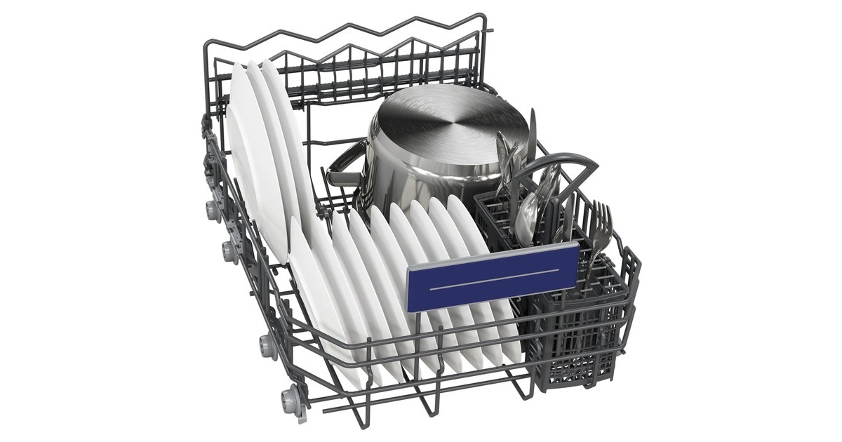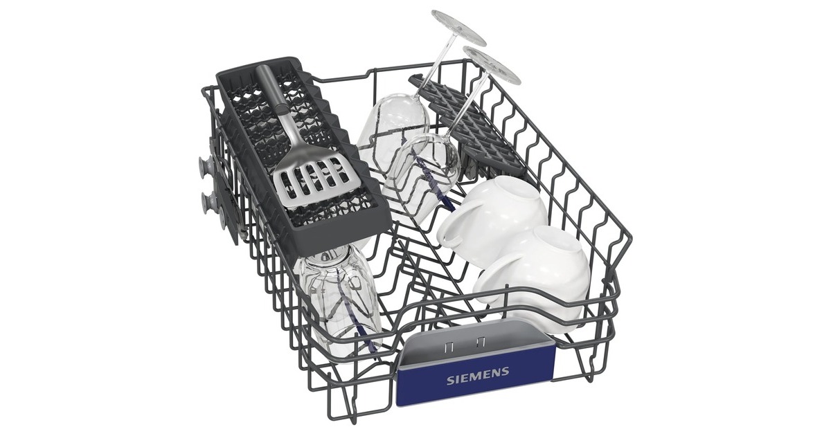Komfortrollen, Korbstopper, 2x Umklappbare Klappstachelreihen, Vario-Besteckkorb, Tassenablage (2-teilig), Gläseranlagebügel |