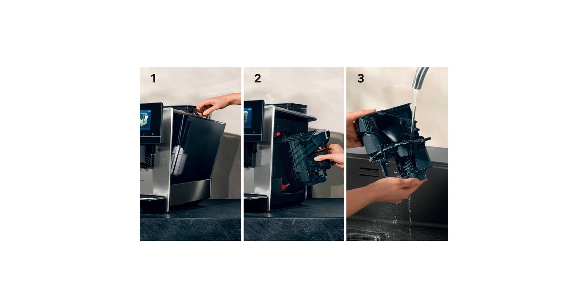 Spülmaschinenfeste Teile: Milchschäumer, Tropfschale, Kaffeesatzbehälter, Milchdüse und Milchbehälter |