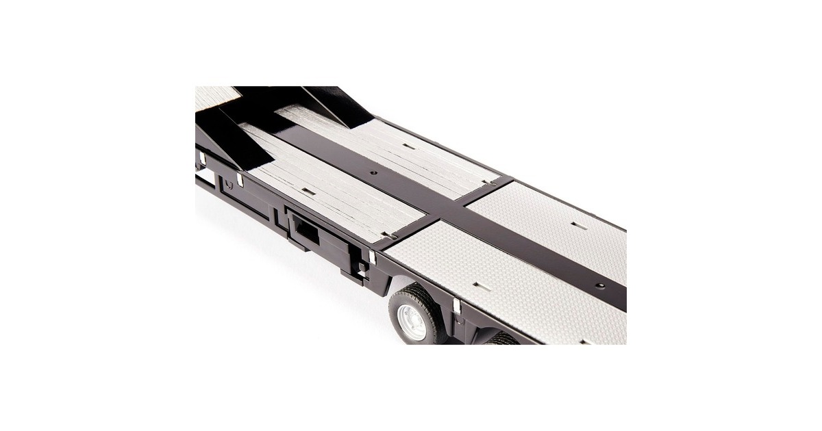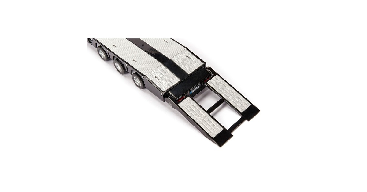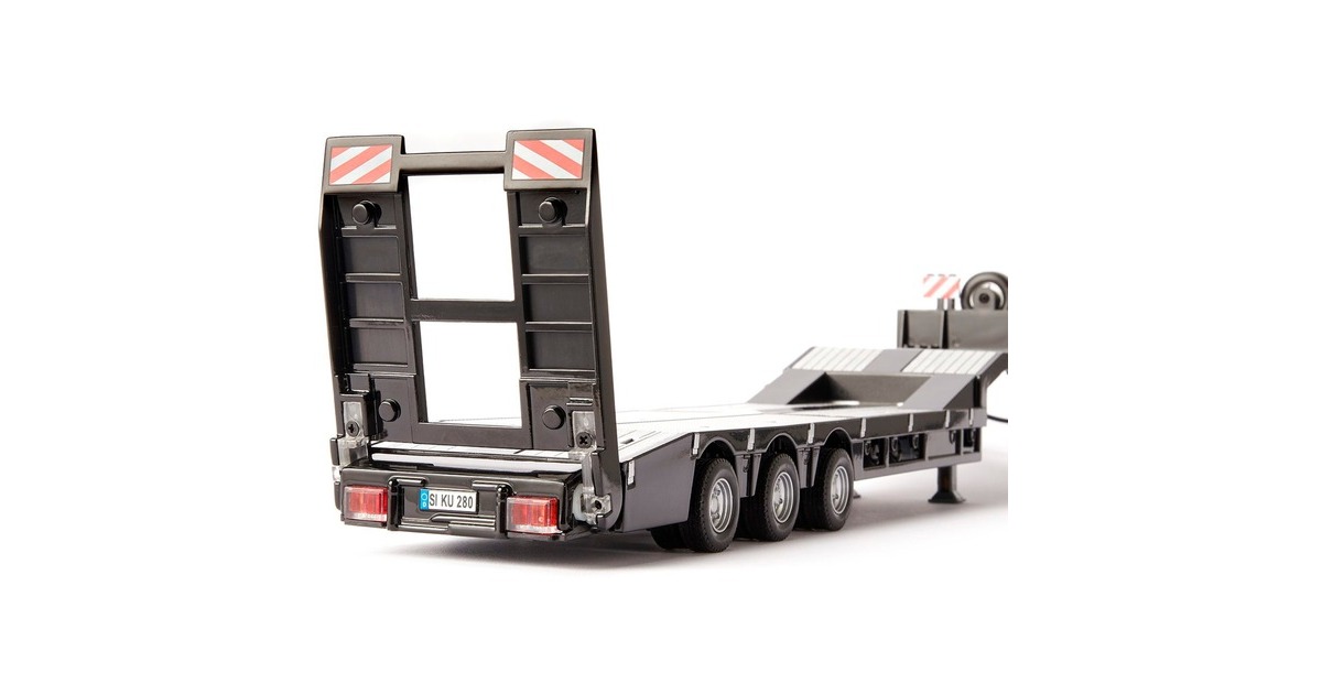 Wer schwere Fracht wie große Baumaschinen, Traktoren oder Betonteile transportieren will, braucht einen speziellen Tieflader. Die EURO-Tieflader des niederländischen Herstellers Nooteboom gelten als die besonders robust. Dank der hydraulischen Lenkung lassen sich die schweren Spezialtransporter außerdem ausgezeichnet manövrieren. Der 3-Achs-Tieflader von Siku ist dem Eurotrailer von Noteboom nachempfunden. Der Auflieger hat die Form eines tiefen Bettes, am Heck befindet sich eine elektronische Rampe, um die schwere Last leichter verladen zu können. Das Fahrgestell des Tiefladers ist aus Metall, der Aufbau auf Kunststoff. Für zusätzliche Stabilität im Stand lassen sich Stützfüße manuell ausfahren. Am Heck des Aufliegers befinden sich vier LEDs: Zwei Fahrlichter in Rot und zwei Blinker. Per Kabel mit Klinkenstecker wird der Tieflader mit der entsprechenden Bluetooth-Zugmaschine aus der CONTROL-Reihe verbunden - zum Beispiel mit einem LKW oder Traktor. Diese wiederum kann ganz einfach per CONTROL-App oder passendem Fernsteuermodul navigiert werden.