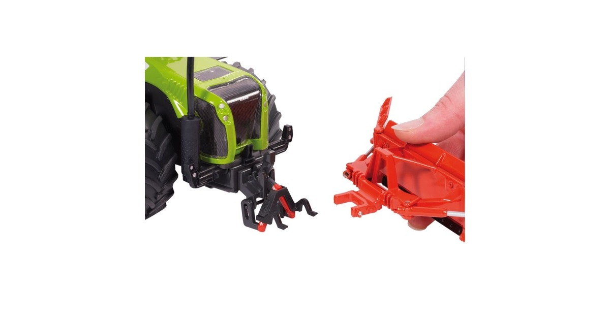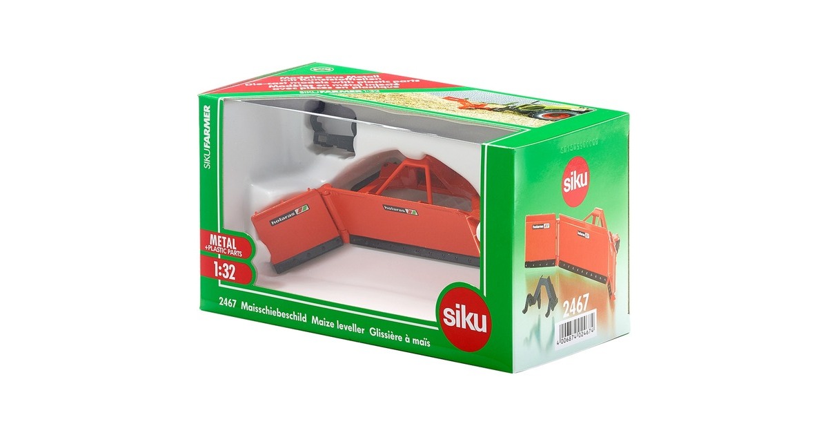 Die Erntekette Mais wird durch das SIKU-Maisschiebeschild der holländischen Firma Holaras eindrucksvoll geschlossen. Das dreiteilige Schild aus Metall kann kraftvoll, auch mit den größten Traktoren, im Silo bewegt werden. Die Schilderelemente rechts und links vom mittleren Hauptschild sind beweglich. So lassen sich die Schubbreite und Richtung des Schüttgutes variieren. Das Maisschiebeschild kann sowohl an der Heckkupplung als auch, mittels eines beiliegenden Adapters, an der Frontkupplung von SIKU-Traktoren befestigt werden.