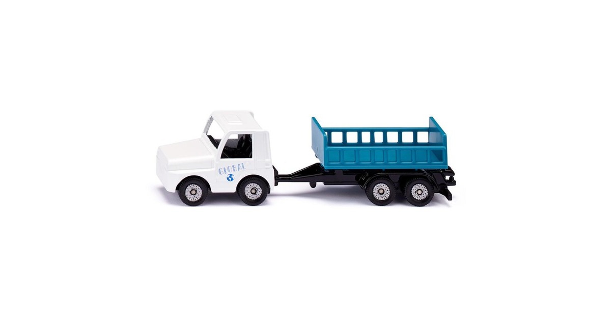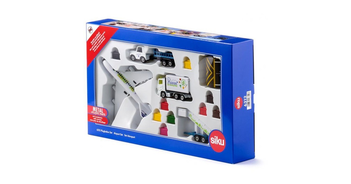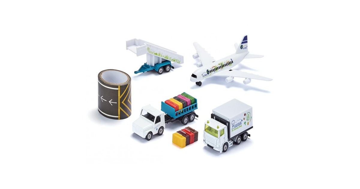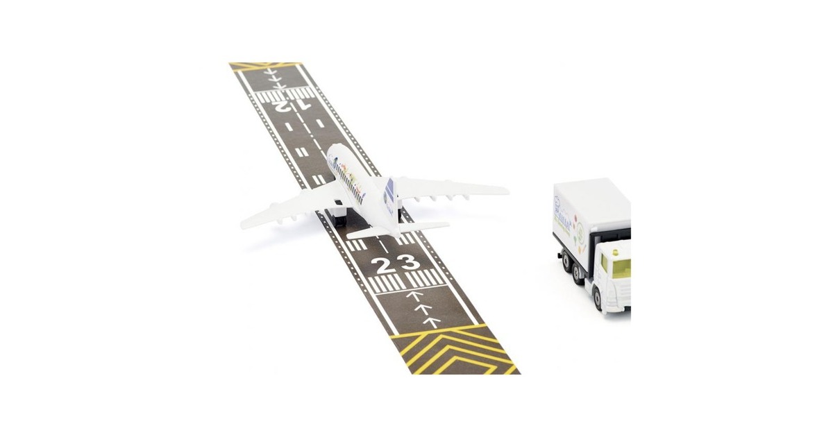 Der Flughafen ist für kleine und große Fluggäste faszinierend. Ständig ankommende und abfliegende Flugzeuge, dazwischen umherfahrende Schlepper und Laster. Das neue SIKU Flughafen Set besteht aus einem vierstrahligen Verkehrsflugzeug, einem Catering-Fahrzeug für die Bordverpflegung, einem Anhänger mit Fluggasttreppe, einem Flughafenschlepper und einem Kofferanhänger. Der Kofferanhänger lässt sich mit einer Scherengittermechanik in der Höhe verstellen. Das erleichtert zusammen mit der Front- und Heckklappe das Be- und Entladen der Koffer. Diese lassen sich auch öffnen. An den Flughafenschlepper lässt sich nicht nur der Kofferwagen, sondern auch die Fluggasttreppe aus Metall und Kunststoff anhängen. Doch wo starten und landen die Flugzeuge? Im Set ist eine fünf Meter lange Rolle selbstklebendes Tape, bedruckt mit typischen Markierungen, enthalten. Diese kann einfach mit der Schere abgeschnitten werden und haftet auf glatten Bodenbelägen und kurzflorigen Teppichböden.
