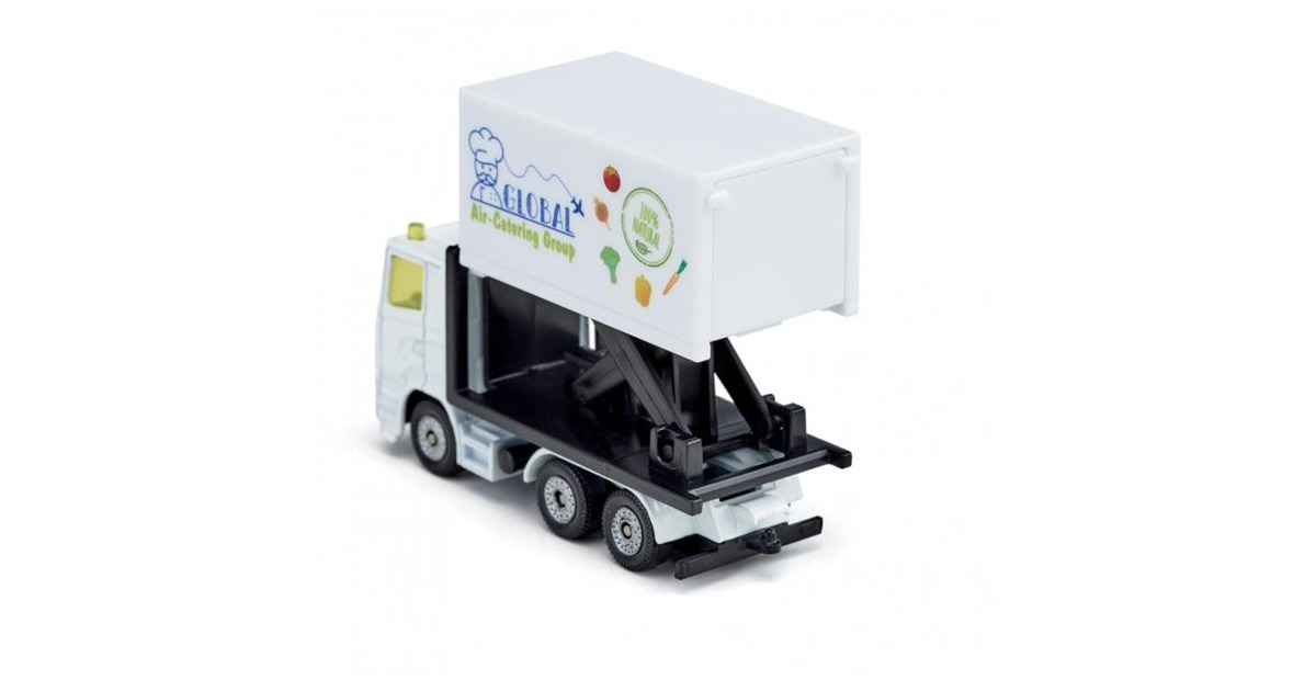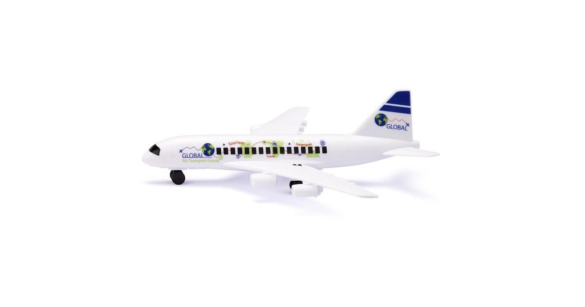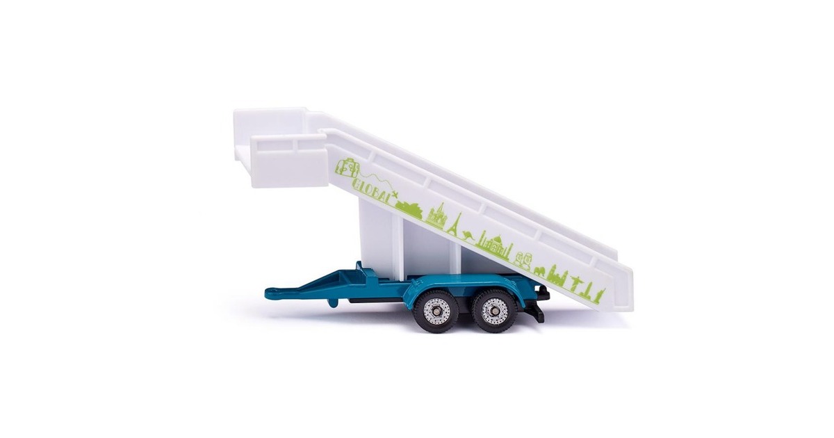Das Set besteht aus einem vierstrahligen Verkehrsflugzeug, einem Catering-Fahrzeug für die Bordverpflegung, einem Anhänger mit Fluggasttreppe, einem Flughafenschlepper, 5 m selbstklebendes Tape und einem Kofferanhänger. Dieser lässt sich mit einer Scherengittermechanik in der Höhe verstellen, Front- und Heckklappe lassen sich öffnen. |