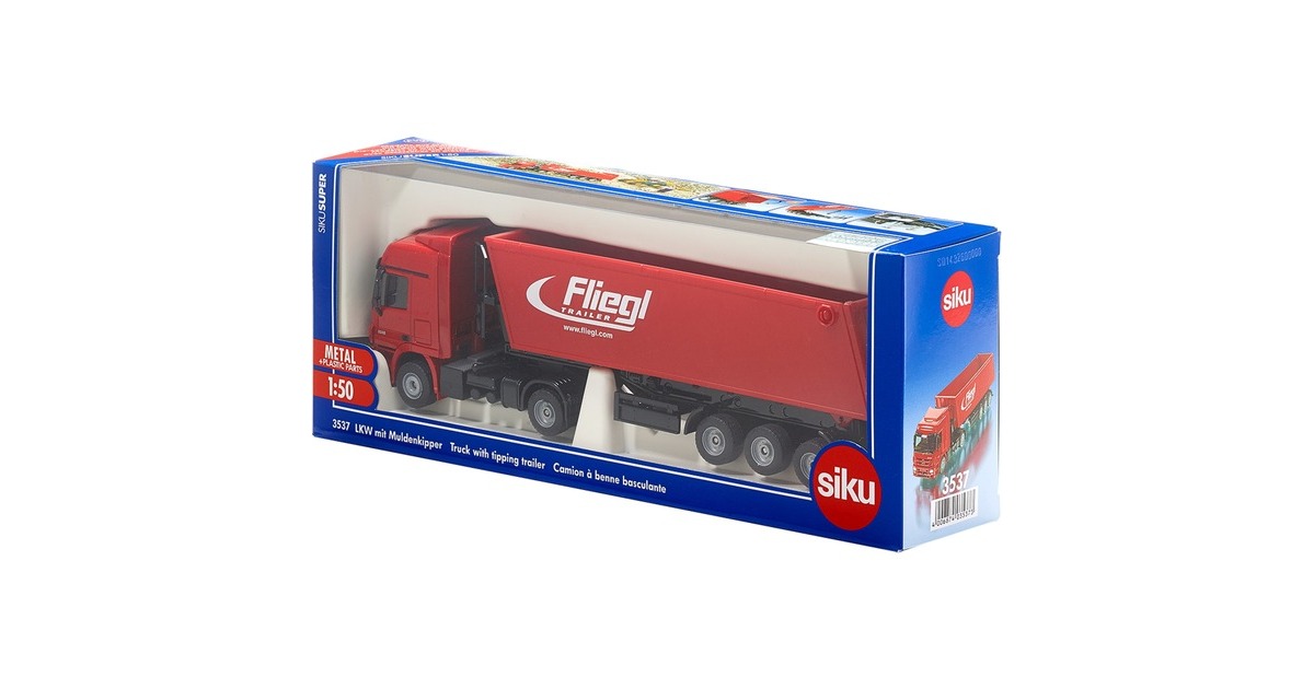 Das neueste Mercedes-Actros-Fahrerhaus mit Spoiler-Paktet als zwei-Achs-Sattelzugmaschine bildet die eindrucksvolle Basis für den LKW mit Muldenkipper. Der drei-Achs-Auflieger mit Kasten-Mulde der Marke Fliegl ist mit einem Metall-Fahrgestell ausgestattet. Die kippbare Mulde sowie der am Fahrgestell montierte Aufstieg mit Podest sind aus Kunststoff gefertigt. Bewegliche Stützfüsse und die zu öffnende Heckklappe der Mulde runden das Bild dieses wuchtigen Sattelzugs für Baustelle und Agrartransport eindrucksvoll ab.Art.-Nr.: 1187606