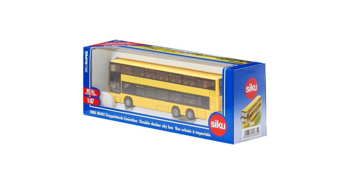 Die aus Berlin bekannten Doppelstockbusse der Marke MAN sind nicht nur im Original eine auffällige Erscheinung. Selbst das 1:87 Metall-Modell von SIKU lässt die wahre Größe dieses Busses erahnen. Das 3-achsige Modell fährt auf komfortbetonten Reifen aus gummiertem Material. Die äußerst detaillierte Modelldarstellung im Innen- und Außenbereich sucht im Spielwarenmarkt ihresgleichen. Das Fahrzeug ist einerseits robust genug für das Kinderzimmer und andererseits eine hochwertige Ergänzung in der Sammlervitrine.Art.-Nr.: 1187547