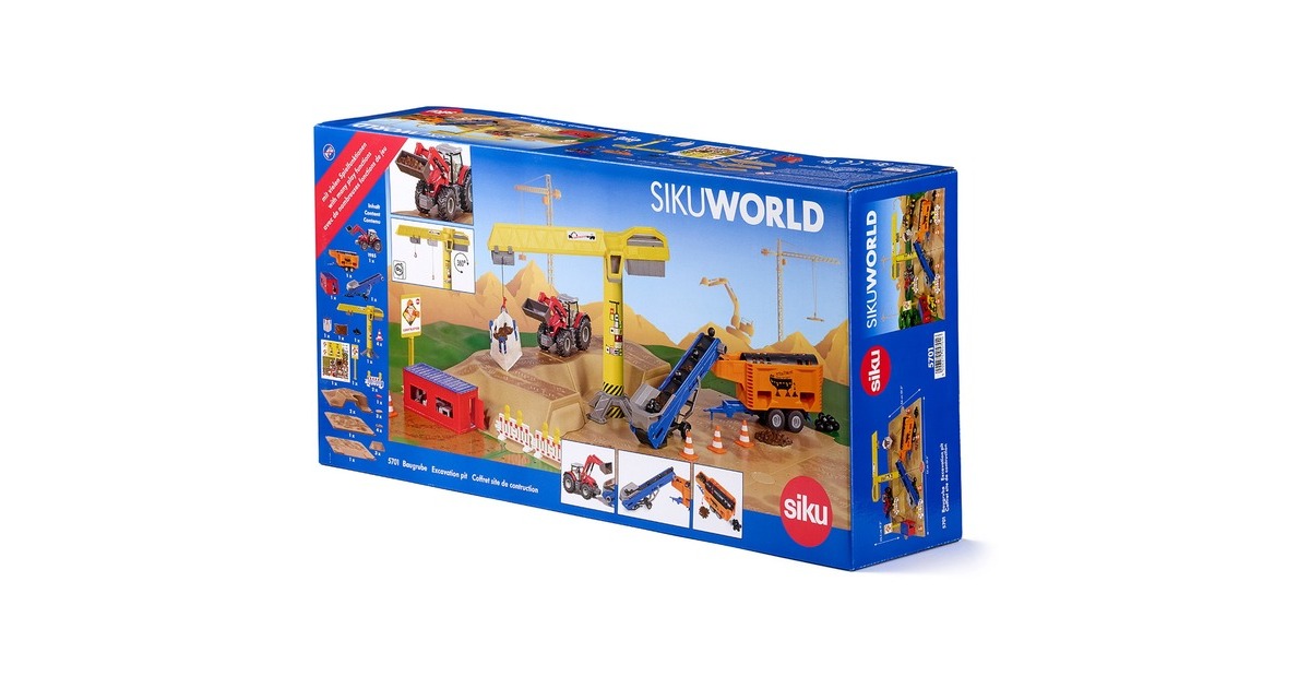 Mit der neuen SIKU WORLD Baugrube wird das Kinderzimmer zur Großbaustelle. Das Set besteht aus vier neuen Grundplatten, die in Farbgebung und Form eine dreidimensionale Baugrube entstehen lassen und auch kompatibel zu den anderen Platten der SIKU WORLD sind. Der Baucontainer steht, die Absperrungen sind aufgestellt und der große Kran ist in Aktion. Die Bauarbeiten können beginnen: Der Ausleger ist schwenkbar und an der beweglichen Laufkatze lässt sich das Baumaterial am Haken aufnehmen und absetzen. Das Förderband ist beweglich und fördert das Baumaterial. Die Sortiereinheit trennt das Abbruchmaterial, damit es sortenrein wieder befördert werden kann. Der im Set enthaltene wendige Traktor hilft beim Materialtransport und rangiert die Maschinen auf der Baustelle.Art.-Nr.: 1524939