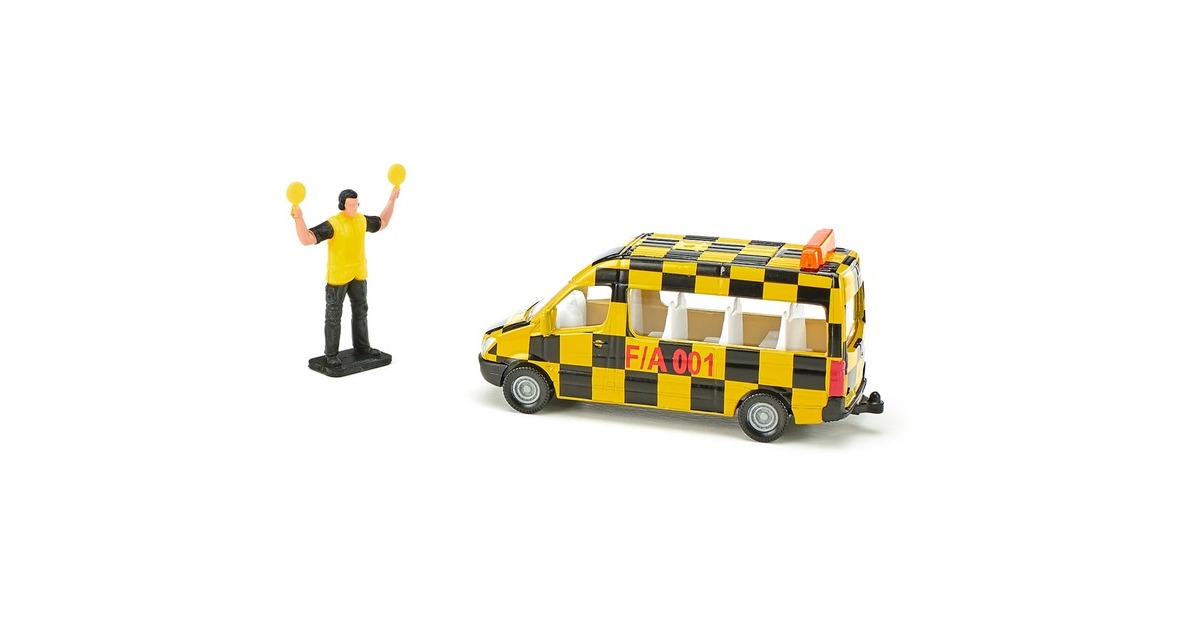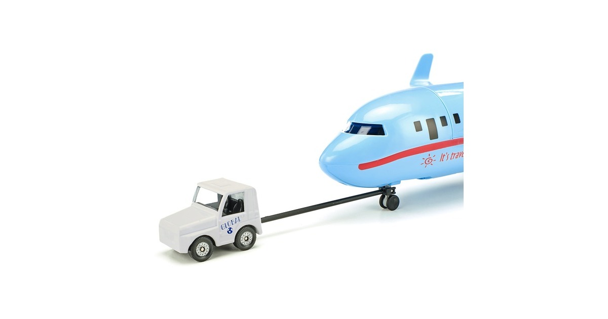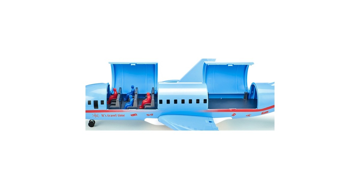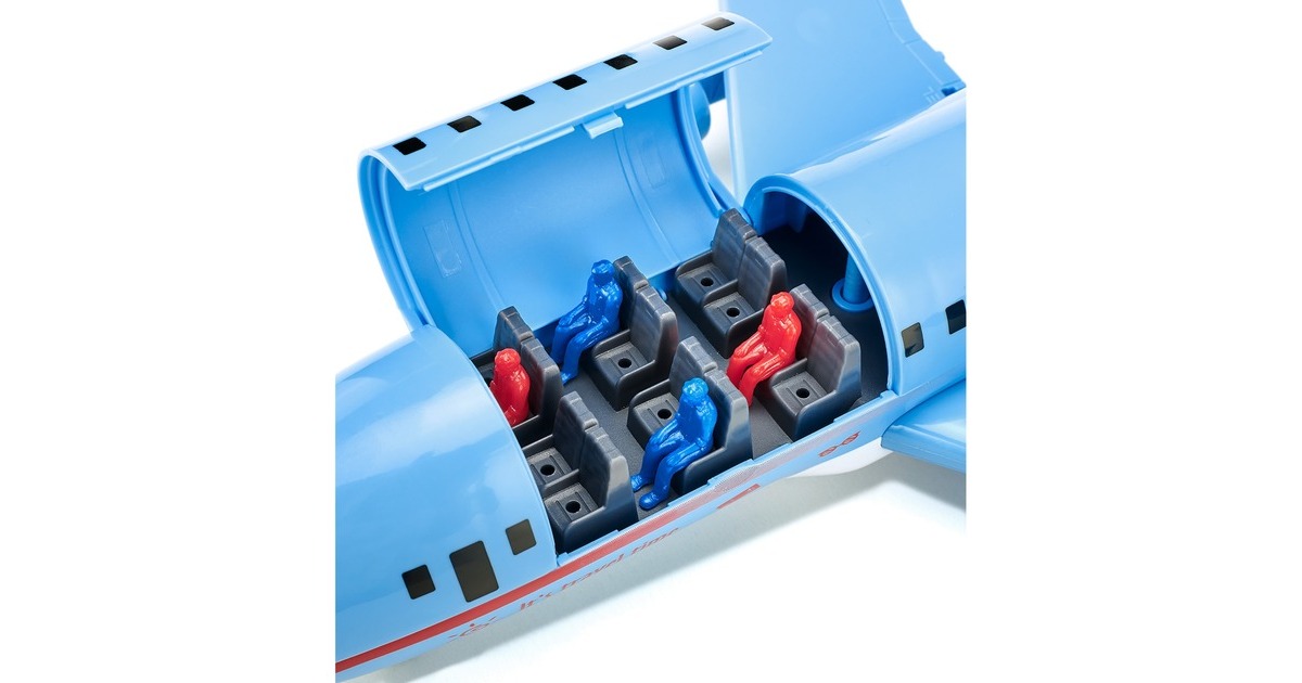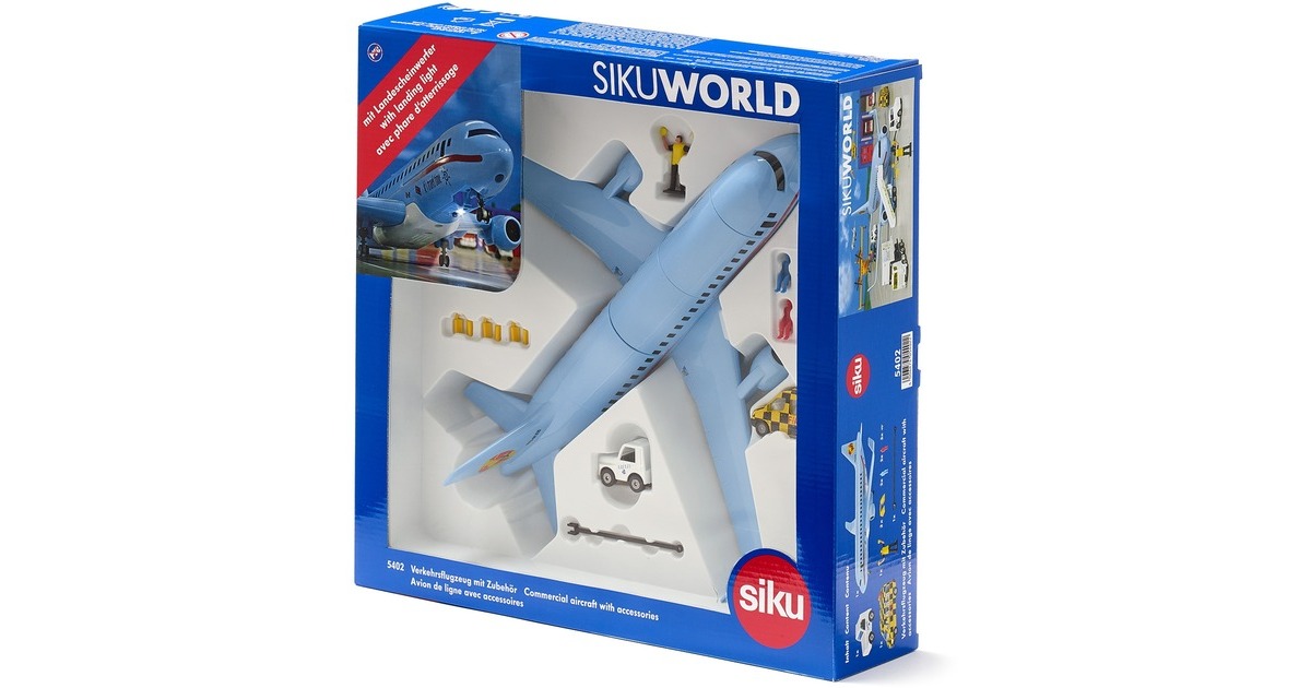 Das große SIKU WORLD Verkehrsflugzeug (38,5 cm) mit den zwei mächtigen Triebwerken steht zum Einsteigen bereit. Doch wer sitzt wo? Das Kabinenpersonal kann einfach die vordere Klappe im Dach anheben und die vier Passagiere ihre Plätzen zuweisen. In der hinteren Klappe ist Platz im Laderaum für das Lieblingsauto, das mit in den Urlaub genommen werden kann. Voller Schub, der Flieger wird schneller und schneller, hebt ab und das Fahrwerk kann eingeklappt werden. Bereit machen zum Landeanflug: Fahrwerk ausklappen und den Landescheinwerfer anmachen. Die LED geht nach zehn Minuten Betriebszeit automatisch aus. Das Flugzeug ist gelandet. Das Follow-me-Fahrzeug begleitet das Flugzeug zur Parkposition. Der Flugzeugschlepper mit der Schleppstange stehen schon für den nächsten Abflug bereit. Art.-Nr.: 1524964