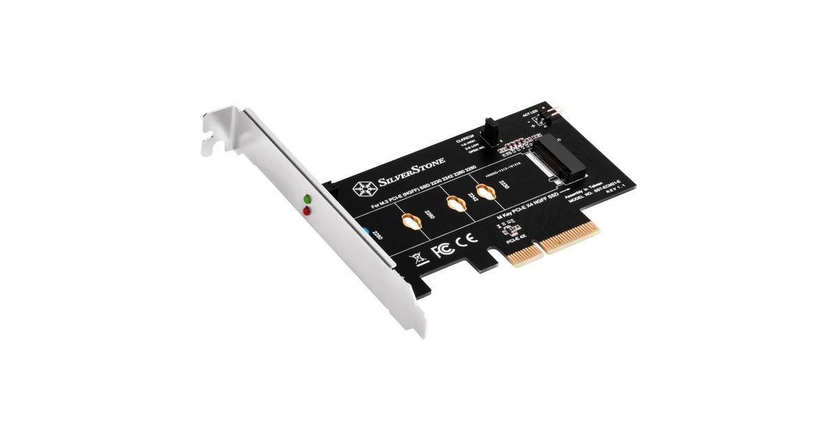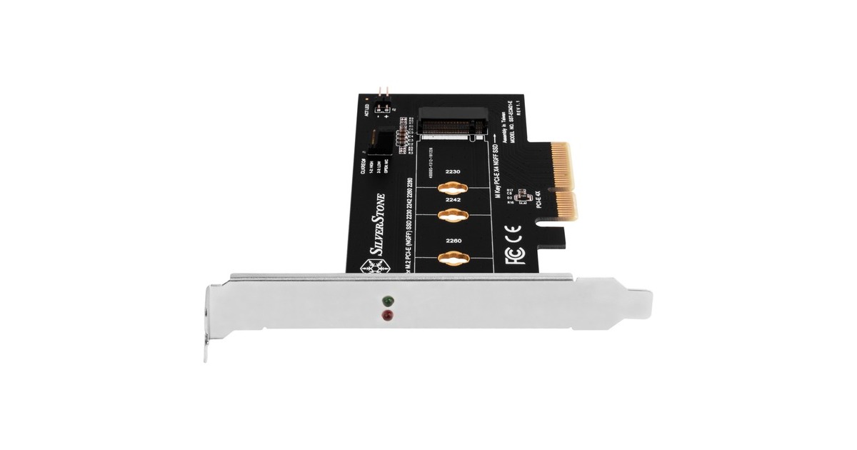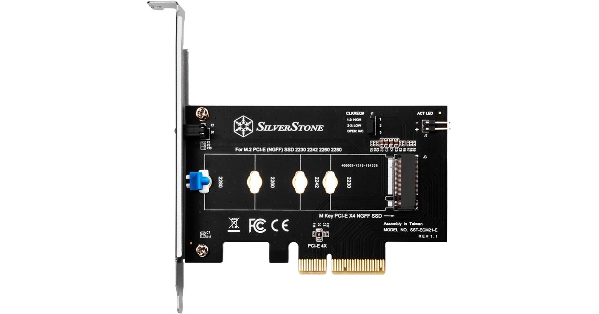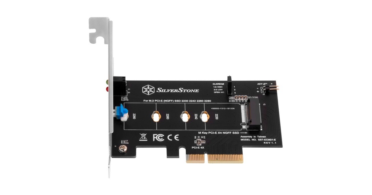 Die SilverStone SST-ECM21-E PCIe-3.0-x4 Adapterkarte besitzt eineschraubenloses Design für M.2 PCIe / NVMe SSDs. Die SilverStone SST-ECM21-E unterstützt PCIe Gen4 M.2 PCIe / NVMe SSD im Formfaktor 2230, 2242, 2260 und 2280. CLKREQ-Überbrückungsstecker. Die LED-Anzeige der SST-ECM21-E zeigen den Status der M.2 PCIe-NVMe SSDs an.Art.-Nr.: 1643865